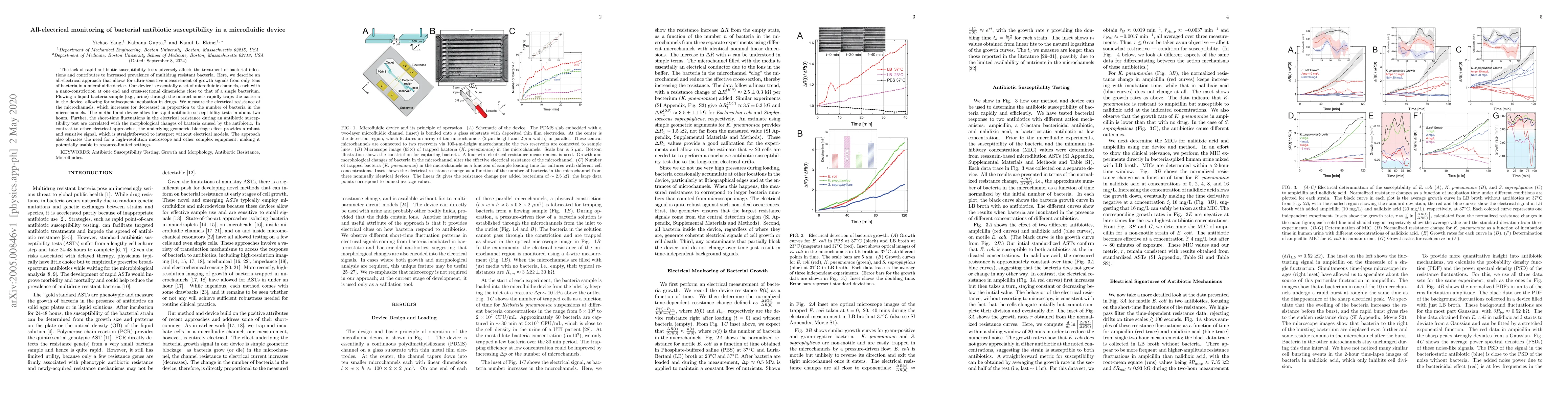 This paper presents an all-electrical microfluidic device for rapid antibiotic susceptibility tests, trapping bacteria in microchannels to measure electrical resistance changes correlating with bacterial growth and morphological changes. This method provides a simple, sensitive, and rapid alternative for detecting antibiotic resistance in about two hours, without requiring complex equipment.