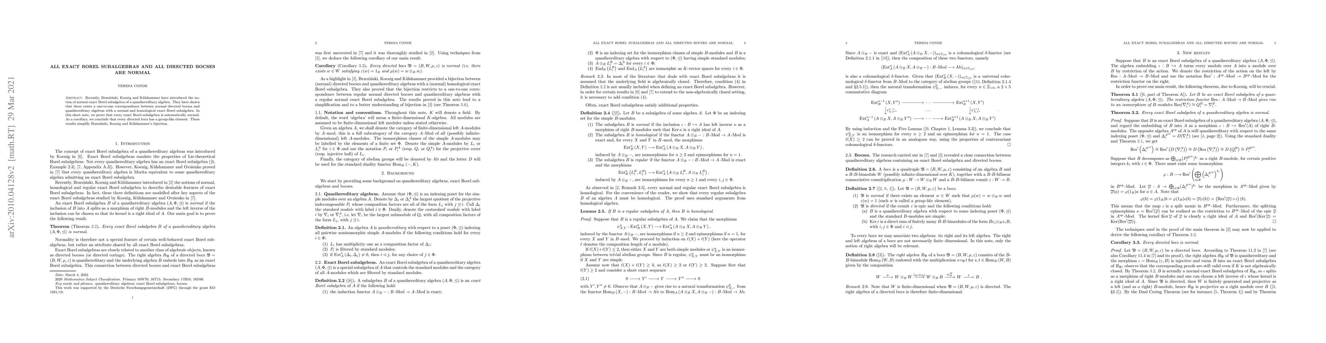 Title: All exact Borel subalgebras and all directed bocses are normal Summary: The paper proves that every exact Borel subalgebra is normal, thereby simplifying the established correspondence between normal directed bocses and quasihereditary algebras, and concluding that every directed bocs has a group-like element.
