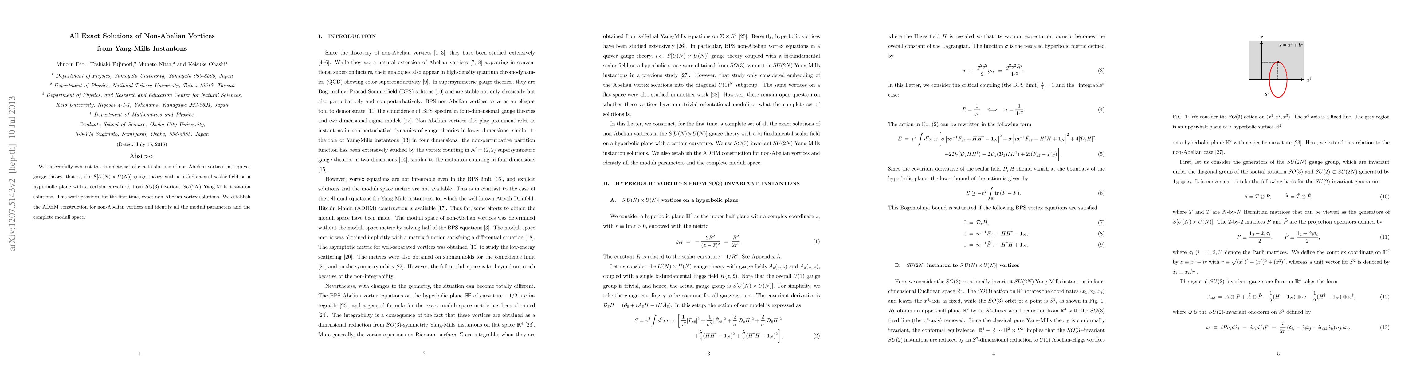 This paper presents the first complete set of exact solutions for non-Abelian vortices in a quiver gauge theory, derived from SO(3)-invariant SU(2N) Yang-Mills instantons. The authors establish the ADHM construction and identify the moduli parameters and complete moduli space for these solutions.