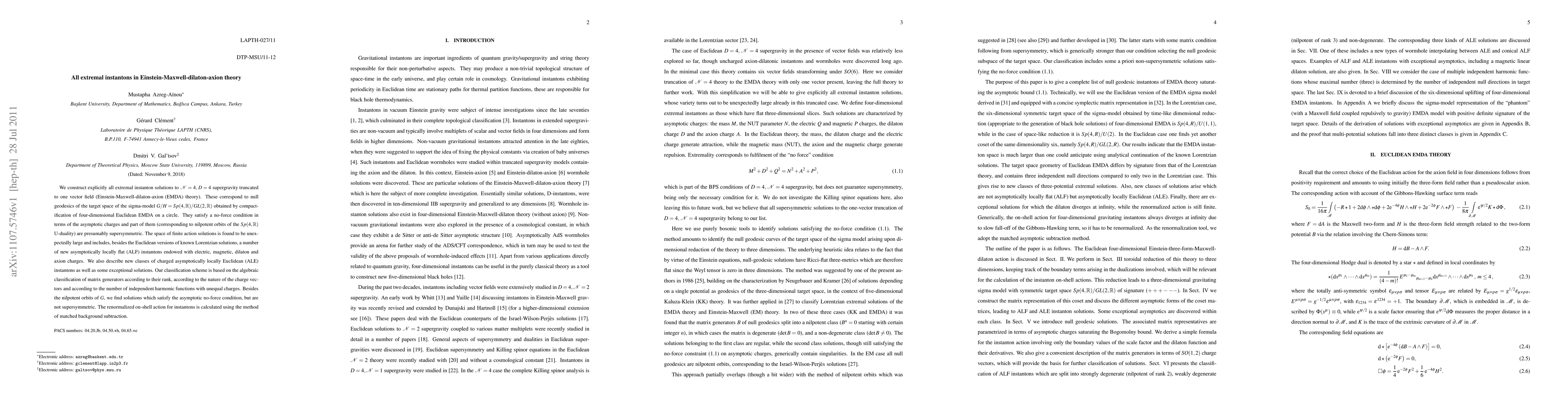 This paper constructs all extremal instanton solutions for the Einstein-Maxwell-dilaton-axion (EMDA) theory, revealing a large space of finite action solutions including new asymptotically locally flat instantons with various charges. The study also identifies new classes of charged asymptotically locally Euclidean instantons and exceptional solutions, employing an algebraic classification scheme based on matrix generators and charge vectors.