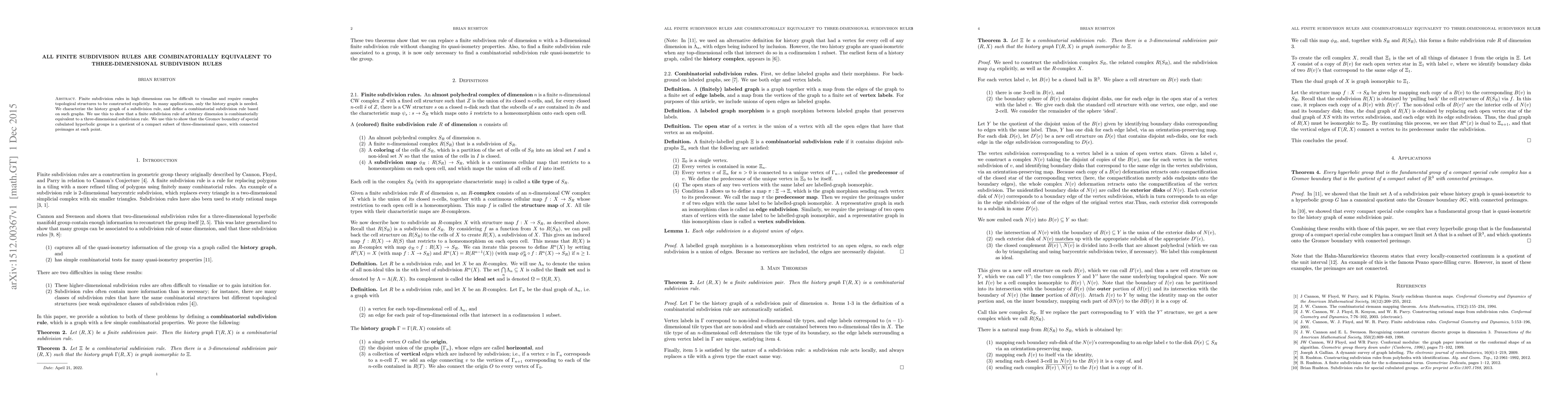 Finite subdivision rules in high dimensions can be difficult to visualize and require complex topological structures to be constructed explicitly. In many applications, only the history graph is needed. We characterize the history graph of a subdivision rule, and define a combinatorial subdivision rule based on such graphs. We use this to show that a finite subdivision rule of arbitrary dimension is combinatorially equivalent to a three-dimensional subdivision rule. We use this to show that the Gromov boundary of special cubulated hyperbolic groups is a quotient of a compact subset of three-dimensional space, with connected preimages at each point.