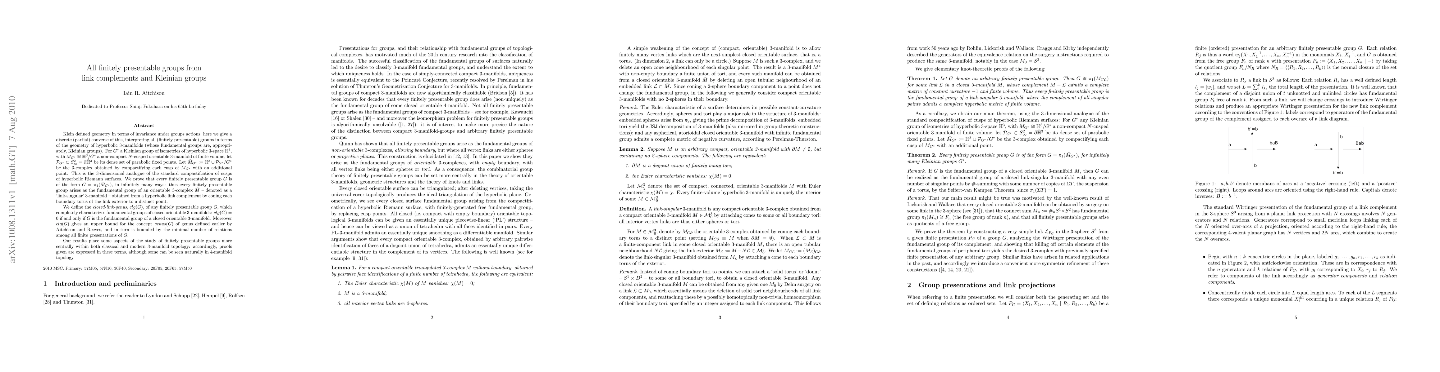 We prove that every finitely presentable group G arises as the fundamental group of an orientable 3-complex obtained from a hyperbolic link complement, by coning each boundary torus of the link exterior to a distinct point. We define the closed-link-genus, clg(G), of any finitely presentable group G, which completely characterizes fundamental groups of closed orientable 3-manifolds: clg(G)=0 if and only if G is the fundamental group of a closed orientable 3-manifold. Moreover clg(G) gives an upper bound for the concept `genus(G)' of genus defined earlier by Aitchison and Reeves, and in turn is bounded by the minimal number of relations among all finite presentations of G.