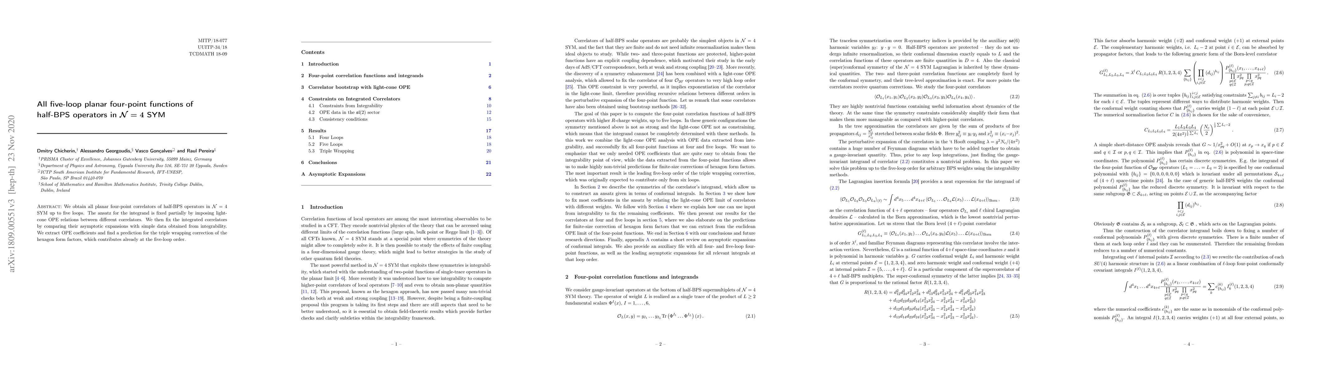 We obtain all planar four-point correlators of half-BPS operators in $\mathcal{N}=4$ SYM up to five loops. The ansatz for the integrand is fixed partially by imposing light-cone OPE relations between different correlators. We then fix the integrated correlators by comparing their asymptotic expansions with simple data obtained from integrability. We extract OPE coefficients and find a prediction for the triple wrapping correction of the hexagon form factors, which contributes already at the five-loop order.