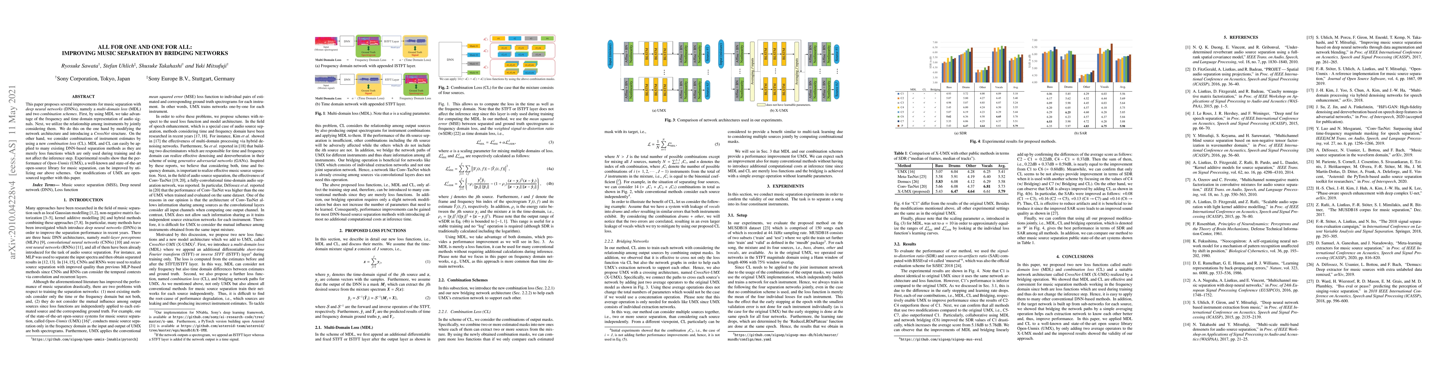 This paper proposes several improvements for music separation with deep neural networks (DNNs), namely a multi-domain loss (MDL) and two combination schemes. First, by using MDL we take advantage of the frequency and time domain representation of audio signals. Next, we utilize the relationship among instruments by jointly considering them. We do this on the one hand by modifying the network architecture and introducing a CrossNet structure. On the other hand, we consider combinations of instrument estimates by using a new combination loss (CL). MDL and CL can easily be applied to many existing DNN-based separation methods as they are merely loss functions which are only used during training and which do not affect the inference step. Experimental results show that the performance of Open-Unmix (UMX), a well-known and state-of-the-art open source library for music separation, can be improved by utilizing our above schemes. Our modifications of UMX are open-sourced together with this paper.
