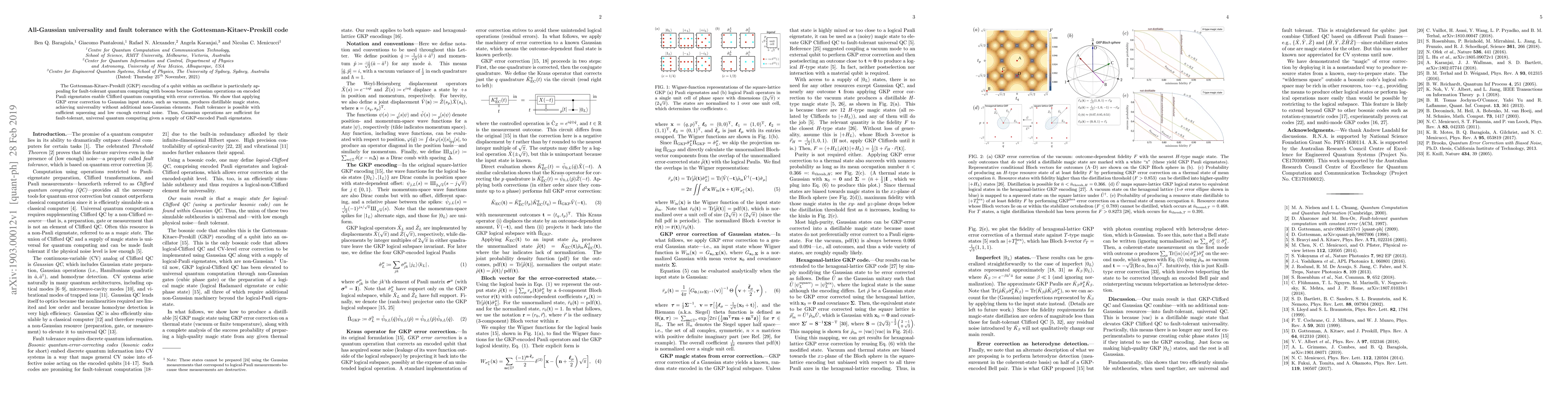 The Gottesman-Kitaev-Preskill (GKP) code enables fault-tolerant quantum computing using Gaussian operations and encoded Pauli eigenstates, achieving universality without non-Gaussian elements. Fault tolerance is feasible with adequate squeezing and minimal external noise.