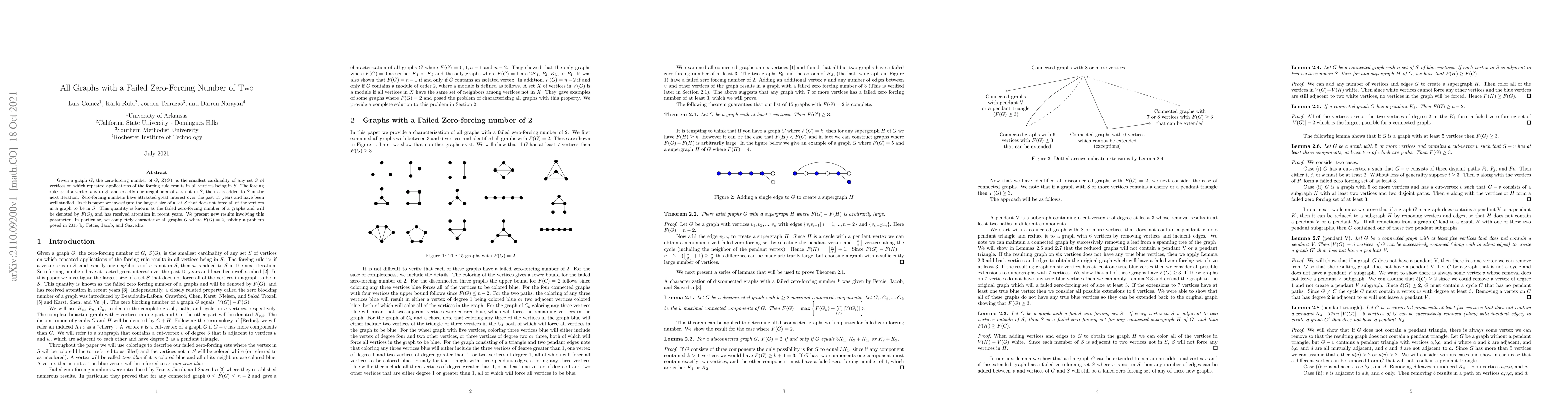 This paper characterizes all graphs where the failed zero-forcing number, $F(G)$, equals two, solving a 2015 problem. It explores the largest set $S$ that does not force all vertices into $S$ using the zero-forcing rule, providing new insights into this parameter.