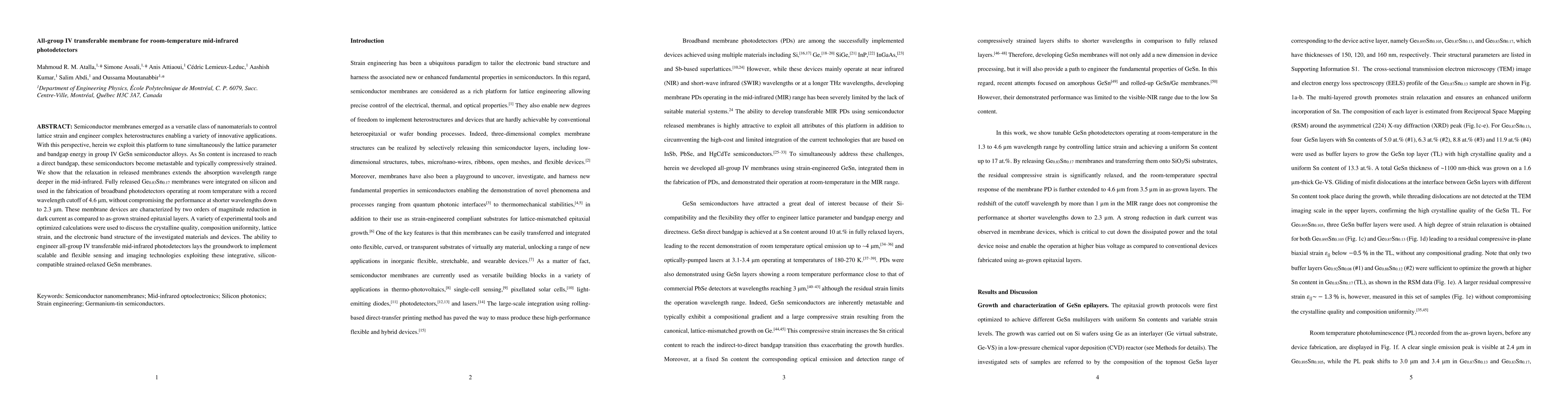 Strain engineering has been a ubiquitous paradigm to tailor the electronic band structure and harness the associated new or enhanced fundamental properties in semiconductors. In this regard, semiconductor membranes emerged as a versatile class of nanoscale materials to control lattice strain and engineer complex heterostructures leading to the development of a variety of innovative applications. Herein we exploit this quasi-two-dimensional platform to tune simultaneously the lattice parameter and bandgap energy in group IV GeSn semiconductor alloys. As Sn content is increased to reach a direct band gap, these semiconductors become metastable and typically compressively strained. We show that the release and transfer of GeSn membranes lead to a significant relaxation thus extending the absorption wavelength range deeper in the mid-infrared. Fully released Ge$_{0.83}$Sn$_{0.17}$ membranes were integrated on silicon and used in the fabrication of broadband photodetectors operating at room temperature with a record wavelength cutoff of 4.6 $\mu$m, without compromising the performance at shorter wavelengths down to 2.3 $\mu$m. These membrane devices are characterized by two orders of magnitude reduction in dark current as compared to devices processed from as-grown strained epitaxial layers. The latter exhibit a content-dependent, shorter wavelength cutoff in the 2.6-3.5 $\mu$m range, thus highlighting the role of lattice strain relaxation in shaping the spectral response of membrane photodetectors. This ability to engineer all-group IV transferable mid-infrared photodetectors lays the groundwork to implement scalable and flexible sensing and imaging technologies exploiting these integrative, silicon-compatible strained-relaxed GeSn membranes.