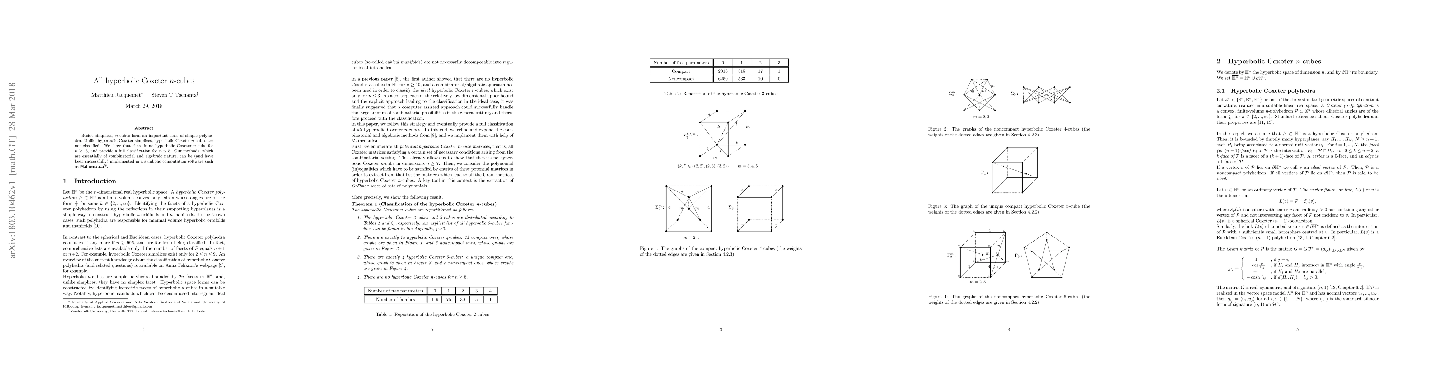 This paper proves that hyperbolic Coxeter $n$-cubes do not exist for $n \geq 6$ and classifies all such cubes for $n \leq 5$ using combinatorial and algebraic techniques, which can be implemented in symbolic computation software like Mathematica$^\circledR$.