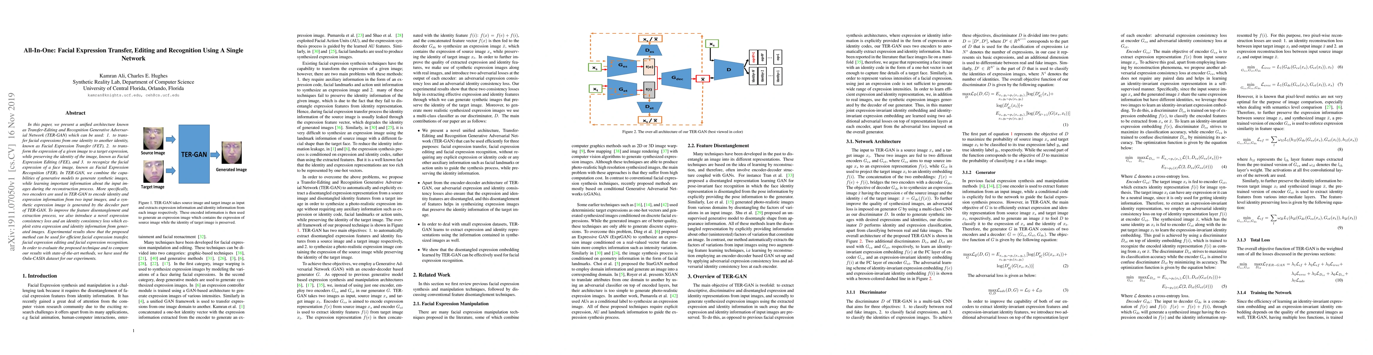 This paper introduces a unified architecture called TER-GAN that performs facial expression transfer, editing, and recognition using a single network. The method combines generative models with encoders to disentangle identity and expression information, achieving efficient results on the Oulu-CASIA dataset.