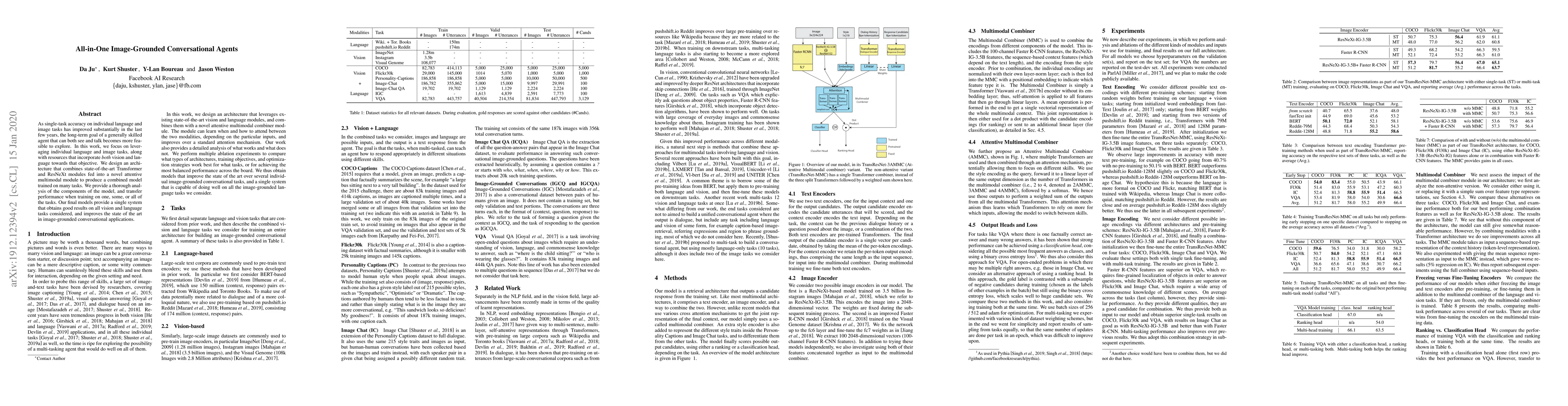 As single-task accuracy on individual language and image tasks has improved substantially in the last few years, the long-term goal of a generally skilled agent that can both see and talk becomes more feasible to explore. In this work, we focus on leveraging individual language and image tasks, along with resources that incorporate both vision and language towards that objective. We design an architecture that combines state-of-the-art Transformer and ResNeXt modules fed into a novel attentive multimodal module to produce a combined model trained on many tasks. We provide a thorough analysis of the components of the model, and transfer performance when training on one, some, or all of the tasks. Our final models provide a single system that obtains good results on all vision and language tasks considered, and improves the state-of-the-art in image-grounded conversational applications.