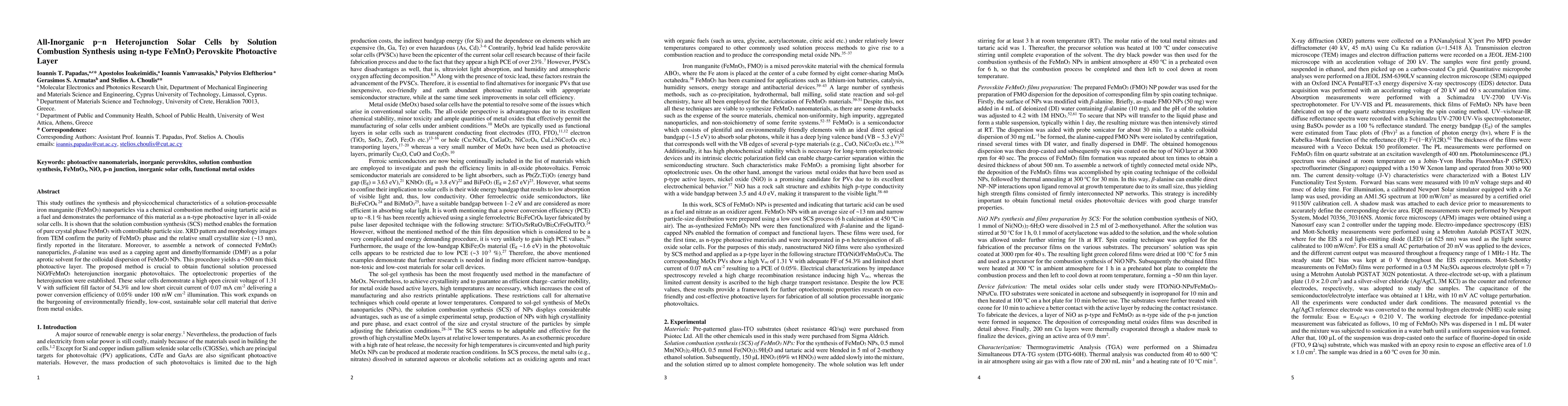 This study explores the synthesis of FeMnO3 nanoparticles via solution combustion, demonstrating their use as a n-type photoactive layer in all-inorganic p-n heterojunction solar cells. The method achieves a high open circuit voltage and moderate power conversion efficiency, highlighting the potential for sustainable, low-cost solar technology.