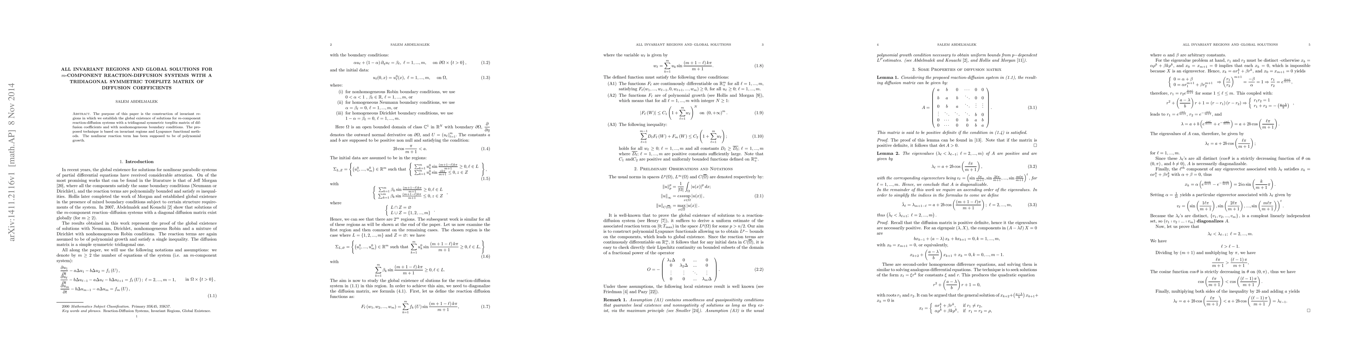 The purpose of this paper is the construction of invariant regions in which we establish the global existence of solutions for m-component reaction-diffusion systems with a tridiagonal symmetric toeplitz matrix of diffusion coefficients and with nonhomogeneous boundary conditions. The proposed technique is based on invariant regions and Lyapunov functional methods. The nonlinear reaction term has been supposed to be of polynomial growth.
