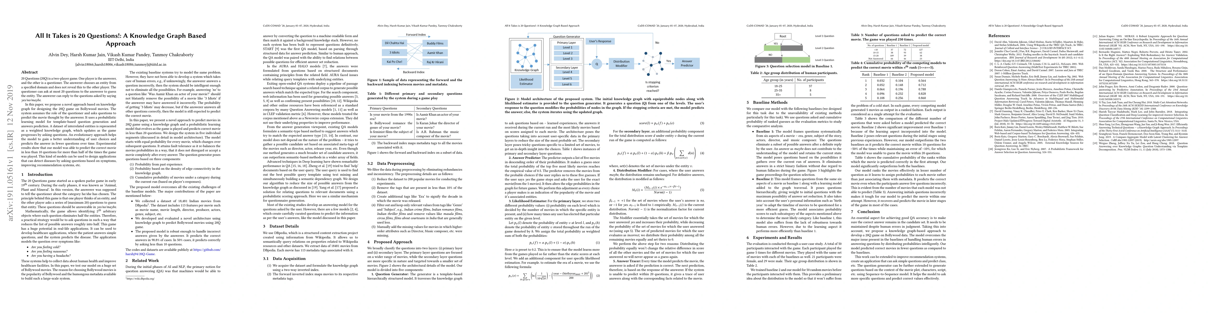 This paper proposes a knowledge graph-based approach to design a 20 Questions game focused on Bollywood movies, utilizing a probabilistic learning model for question generation and answer prediction. The system effectively predicts the chosen movie in fewer than 10 questions over half the game instances, demonstrating potential applications in disease detection and recommendation systems.