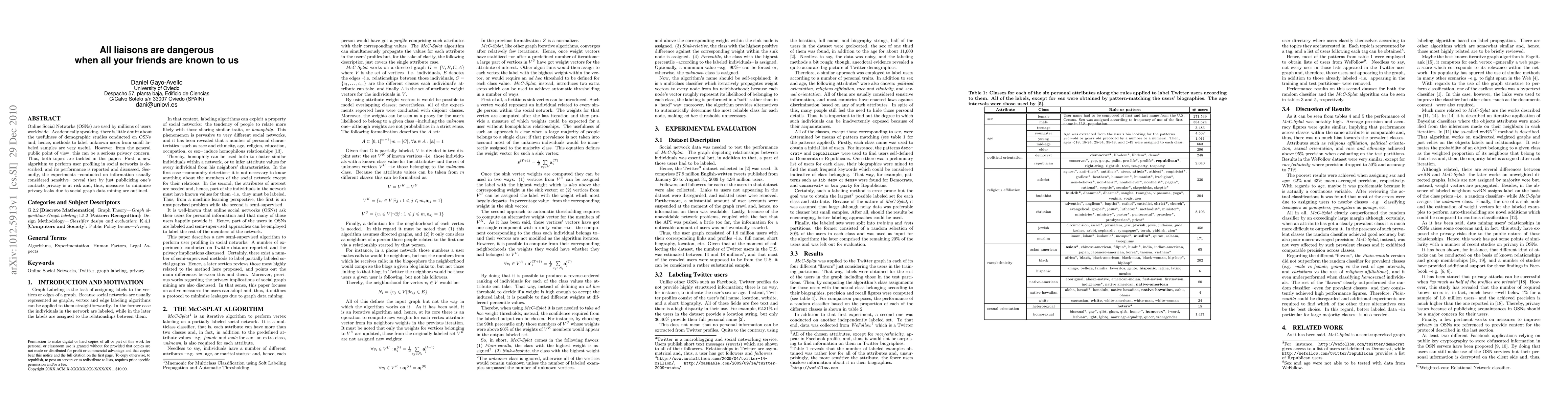 Online Social Networks (OSNs) are used by millions of users worldwide. Academically speaking, there is little doubt about the usefulness of demographic studies conducted on OSNs and, hence, methods to label unknown users from small labeled samples are very useful. However, from the general public point of view, this can be a serious privacy concern. Thus, both topics are tackled in this paper: First, a new algorithm to perform user profiling in social networks is described, and its performance is reported and discussed. Secondly, the experiments --conducted on information usually considered sensitive-- reveal that by just publicizing one's contacts privacy is at risk and, thus, measures to minimize privacy leaks due to social graph data mining are outlined.