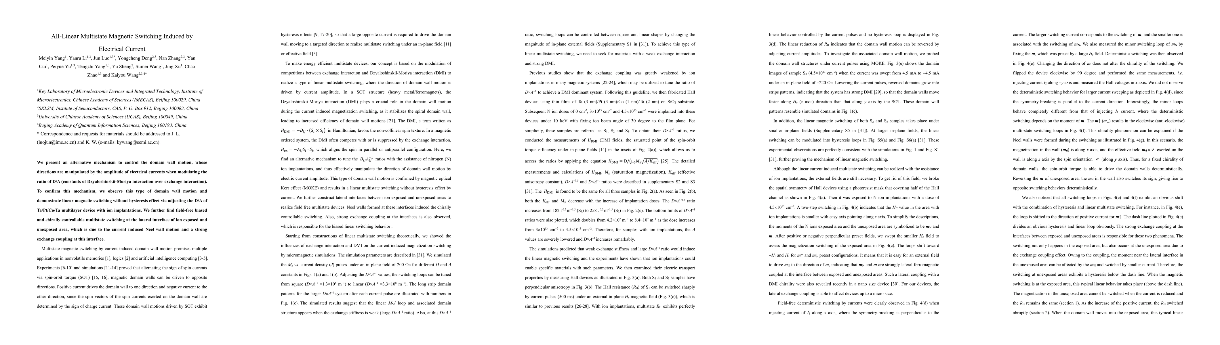 The research introduces a novel method to control magnetic domain wall motion using electrical current amplitude, modulating the Dzyaloshinskii-Moriya to exchange interaction ratio. This technique demonstrates linear, hysteresis-free magnetic switching in Ta/Pt/Co/Ta multilayer devices, altered by ion implantations. Additionally, it reveals field-free, chirally controllable multistate switching at the interface of ion-exposed and unexposed areas, attributed to current-induced Neel wall motion and strong exchange coupling.