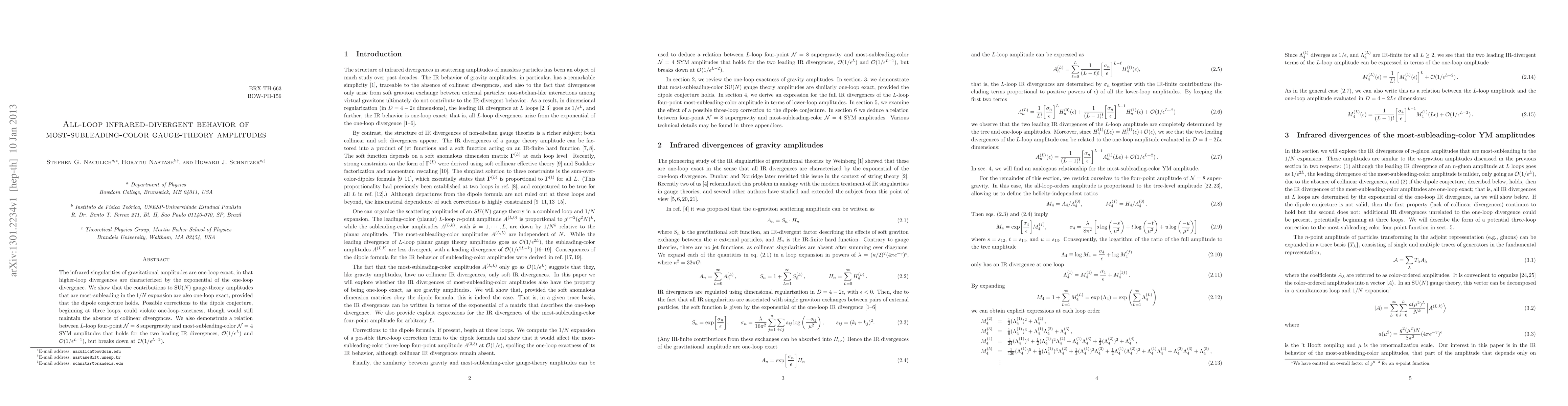 Summary: The paper establishes that most-subleading contributions in SU(N) gauge theory amplitudes are one-loop exact under the dipole conjecture. It also reveals a connection between L-loop four-point N=8 supergravity and most-subleading-color N=4 SYM amplitudes for leading infrared divergences, while noting a breakdown at subleading levels.