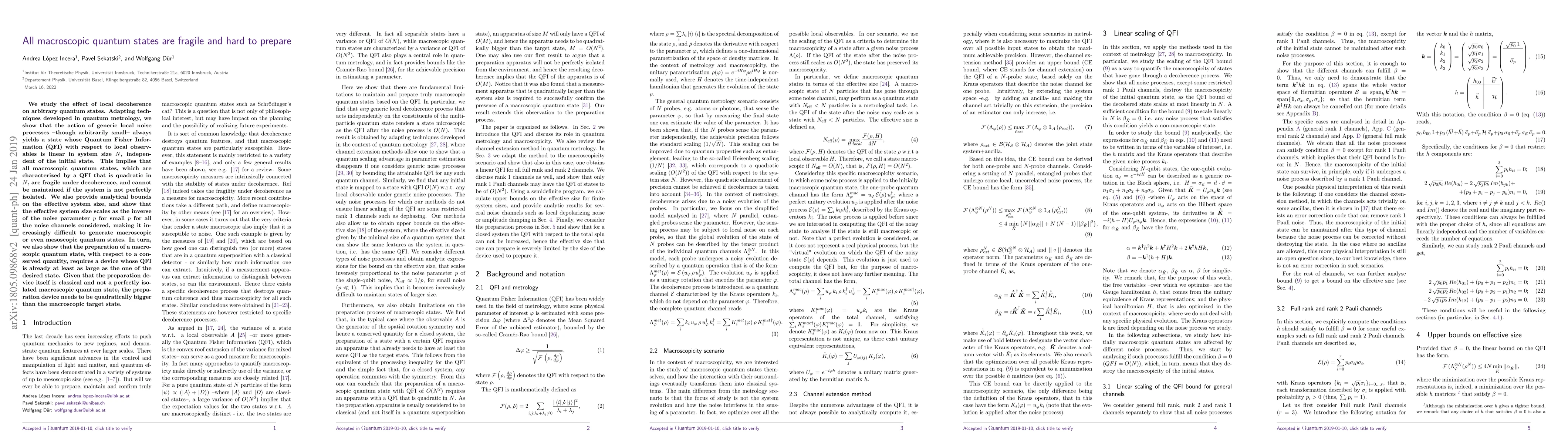 This paper demonstrates that macroscopic quantum states are inherently fragile due to local decoherence, as any small noise process reduces their Quantum Fisher Information linearly with system size, contrasting with the quadratic scaling of ideal macroscopic states. The preparation of such states requires a classical device that is proportionally larger than the target state.