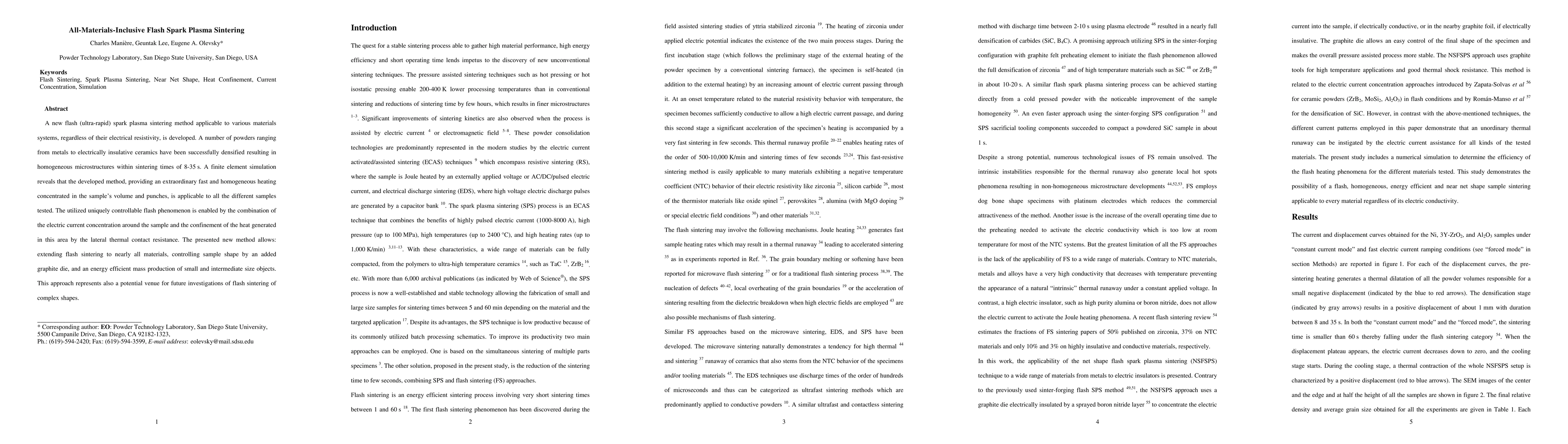 This paper introduces a novel flash spark plasma sintering method that rapidly densifies materials with varying electrical resistivity, achieving homogeneous microstructures in 8-35 seconds. The method's efficiency and controllability enable mass production and future studies on complex shapes.