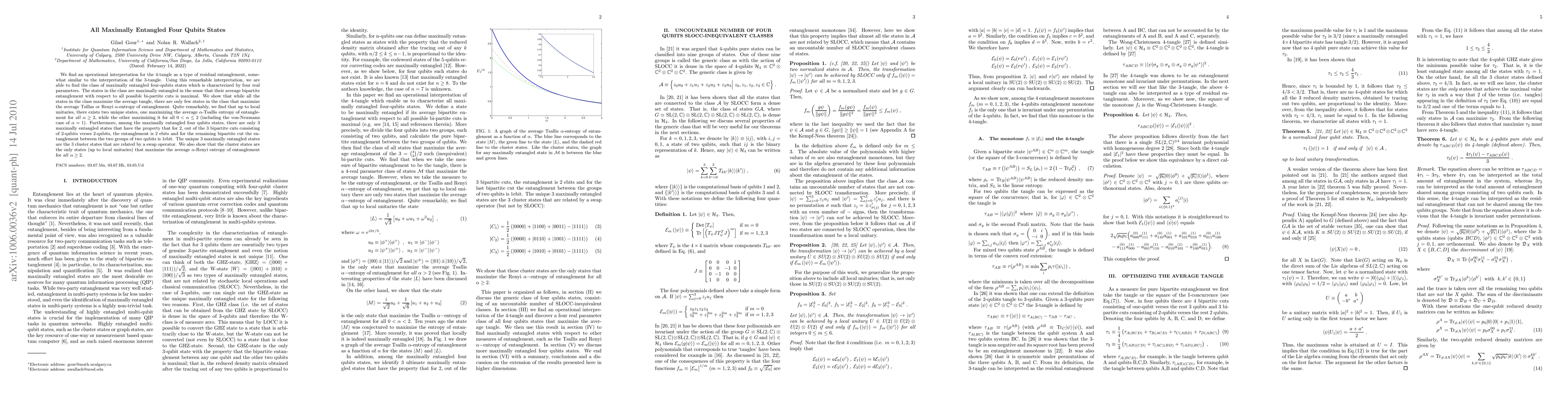 This paper identifies a class of maximally entangled four-qubit states characterized by four real parameters, which maximize average bipartite entanglement across all cuts. It highlights two unique states maximizing different types of $\alpha$-Tsallis entropy of entanglement, and reveals that cluster states are the only states maximizing average $\alpha$-Renyi entropy for $\alpha \geq 2$.