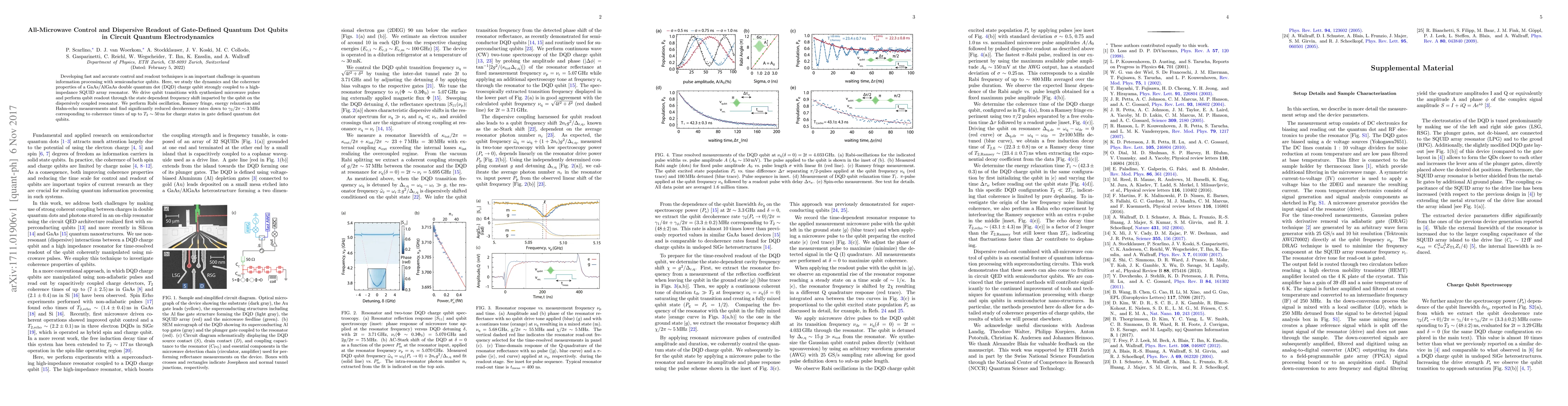This paper investigates the dynamics and coherence of GaAs/AlGaAs double quantum dot qubits in circuit quantum electrodynamics, utilizing microwave pulses for control and dispersive readout. The study reports reduced decoherence rates, achieving coherence times up to 50 ns.