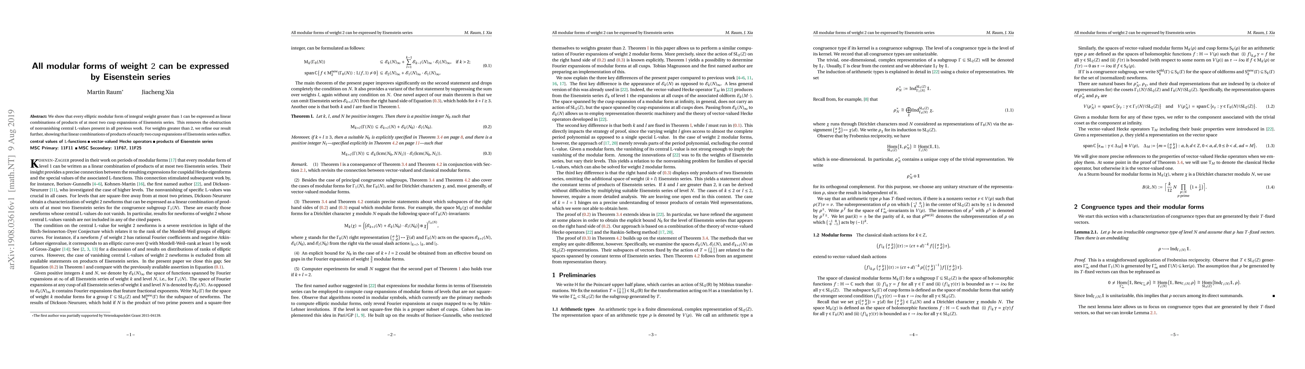 Summary: This paper demonstrates that all elliptic modular forms of weight 2 can be represented using Eisenstein series, specifically linear combinations of products of at most two cusp expansions, resolving previous issues with nonvanishing central L-values. For weights greater than 2, the result is further refined to exact combinations of two cusp expansions.