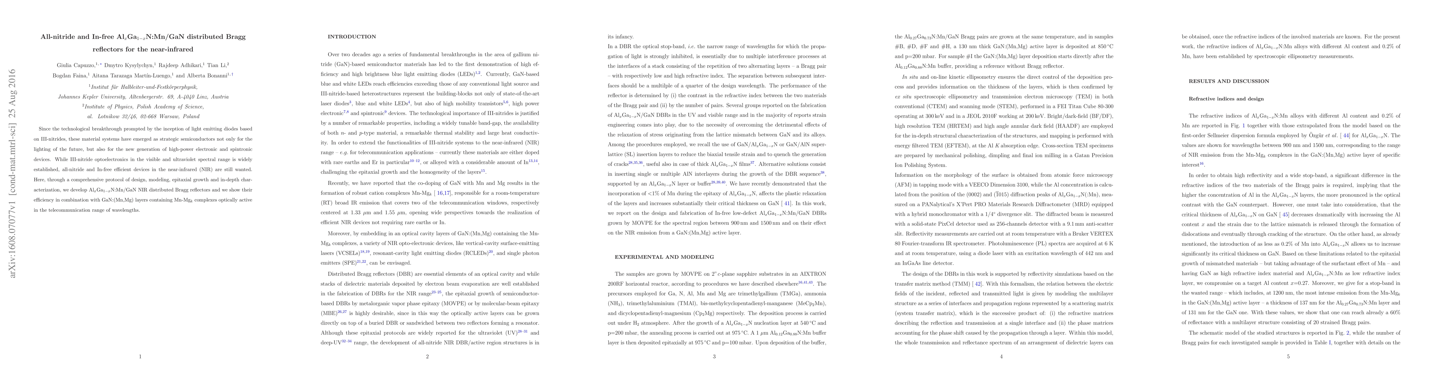 This paper develops all-nitride and In-free Al$_x$Ga$_{1-x}$N:Mn/GaN distributed Bragg reflectors for near-infrared applications, demonstrating their efficiency in combination with GaN:(Mn,Mg) layers for telecommunications. The research combines design, modeling, epitaxial growth, and characterization to achieve efficient NIR devices.