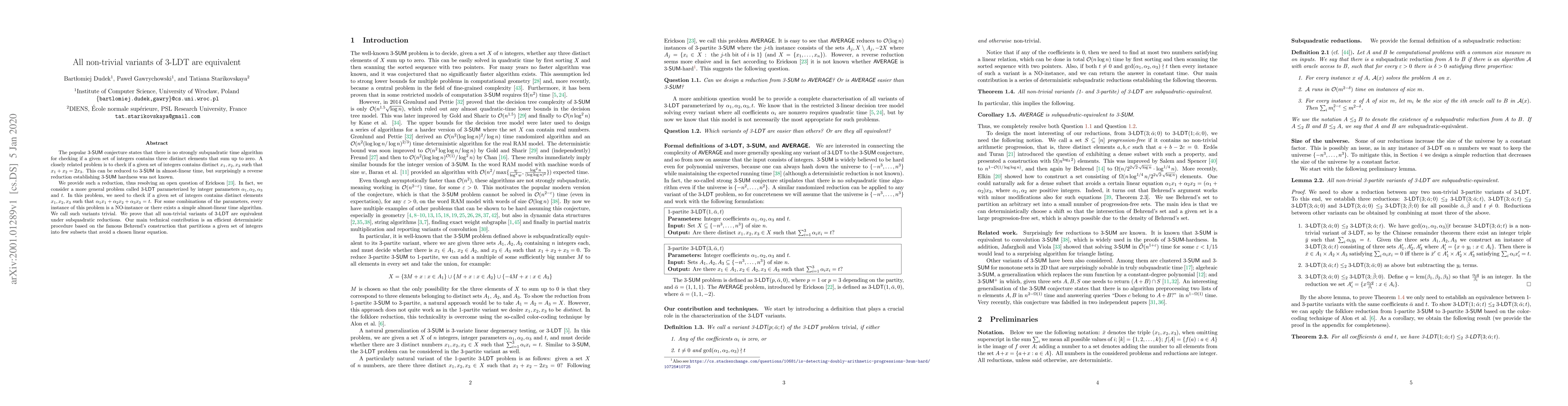 The popular 3-SUM conjecture states that there is no strongly subquadratic time algorithm for checking if a given set of integers contains three distinct elements that sum up to zero. A closely related problem is to check if a given set of integers contains distinct $x_1, x_2, x_3$ such that $x_1+x_2=2x_3$. This can be reduced to 3-SUM in almost-linear time, but surprisingly a reverse reduction establishing 3-SUM hardness was not known. We provide such a reduction, thus resolving an open question of Erickson. In fact, we consider a more general problem called 3-LDT parameterized by integer parameters $\alpha_1, \alpha_2, \alpha_3$ and $t$. In this problem, we need to check if a given set of integers contains distinct elements $x_1, x_2, x_3$ such that $\alpha_1 x_1+\alpha_2 x_2 +\alpha_3 x_3 = t$. For some combinations of the parameters, every instance of this problem is a NO-instance or there exists a simple almost-linear time algorithm. We call such variants trivial. We prove that all non-trivial variants of 3-LDT are equivalent under subquadratic reductions. Our main technical contribution is an efficient deterministic procedure based on the famous Behrend's construction that partitions a given set of integers into few subsets that avoid a chosen linear equation.