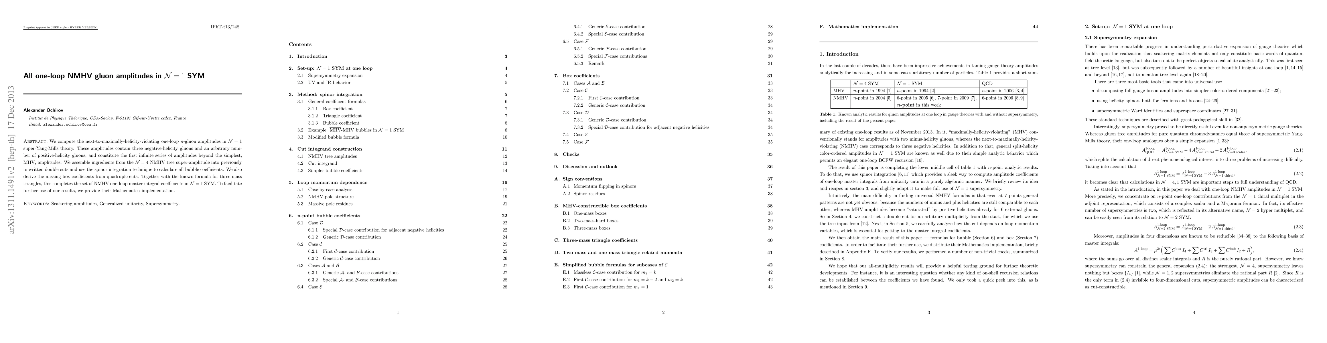 This paper calculates all one-loop next-to-maximally-helicity-violating (NMHV) gluon amplitudes in N=1 super-Yang-Mills theory using spinor integration techniques. It completes the NMHV one-loop master integral coefficients and offers a Mathematica implementation for further research.
