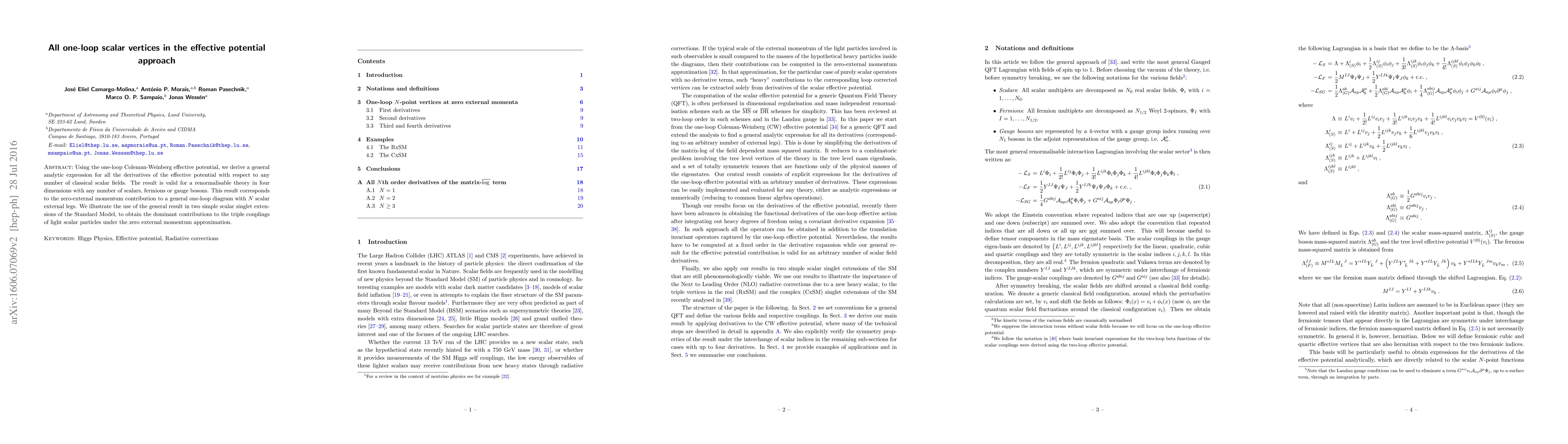 Using the one-loop Coleman-Weinberg effective potential, we derive a general analytic expression for all the derivatives of the effective potential with respect to any number of classical scalar fields. The result is valid for a renormalisable theory in four dimensions with any number of scalars, fermions or gauge bosons. This result corresponds to the zero-external momentum contribution to a general one-loop diagram with N scalar external legs. We illustrate the use of the general result in two simple scalar singlet extensions of the Standard Model, to obtain the dominant contributions to the triple couplings of light scalar particles under the zero external momentum approximation