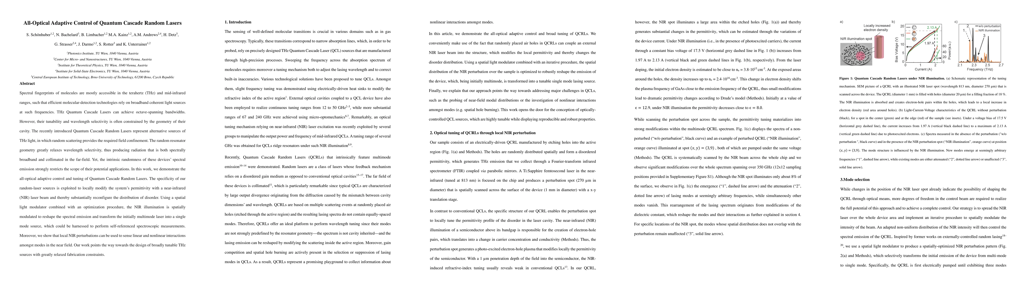 Spectral fingerprints of molecules are mostly accessible in the terahertz and mid-infrared ranges, such that efficient molecular-detection technologies rely on broadband coherent light sources at such frequencies. THz Quantum Cascade Lasers can achieve octave-spanning bandwidths. However, their tunability and wavelength selectivity is often constrained by the geometry of their cavity. The recently introduced Quantum Cascade Random Lasers represent alternative sources of THz light, in which random scattering provides the required field confinement. The random resonator geometry greatly relaxes wavelength selectivity, thus producing radiation that is both spectrally broadband and collimated in the far-field. Yet, the intrinsic randomness of these devices' spectral emission strongly restricts the scope of their potential applications. In this work, we demonstrate the all-optical adaptive control and tuning of Quantum Cascade Random Lasers. The specificity of our random-laser sources is exploited to locally modify the system's permittivity with a near-infrared (NIR) laser beam and thereby substantially reconfigure the distribution of disorder. Using a spatial light modulator combined with an optimization procedure, the NIR illumination is spatially modulated to reshape the spectral emission and transform the initially multimode laser into a single mode source, which could be harnessed to perform self-referenced spectroscopic measurements. Moreover, we show that local NIR perturbations can be used to sense linear and nonlinear interactions amongst modes in the near field. Our work points the way towards the design of broadly tunable THz sources with greatly relaxed fabrication constraints.