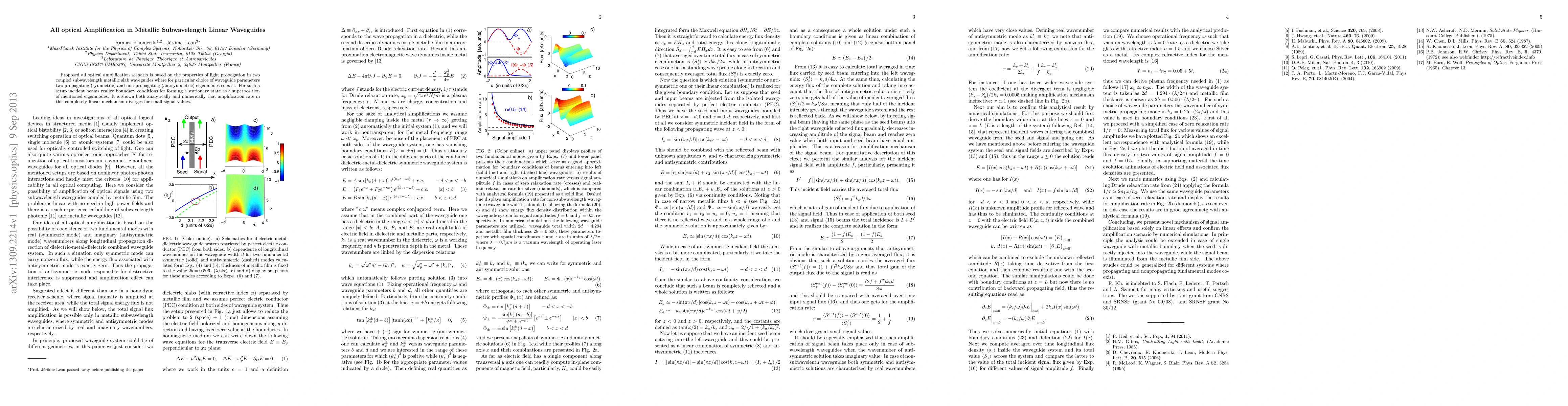 This paper proposes an all-optical amplification method using coupled subwavelength metallic waveguides, where specific waveguide parameters enable the coexistence of two eigenmodes. The amplification rate diverges for small signal values, demonstrating a completely linear mechanism.