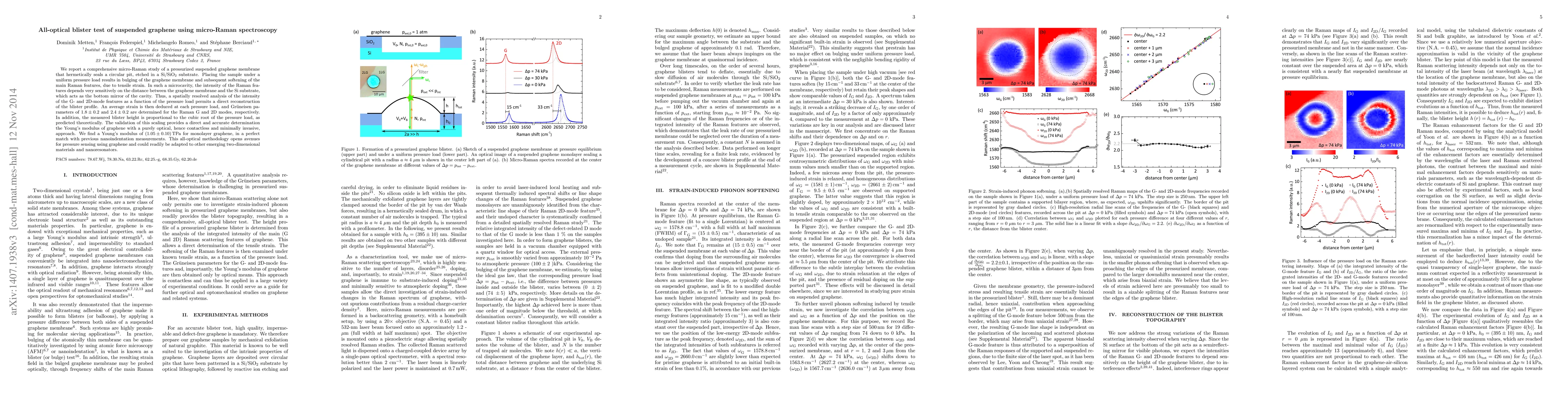 We report a comprehensive micro-Raman study of a pressurized suspended graphene membrane that hermetically seals a circular pit, etched in a Si/SiO$_2$ substrate. Placing the sample under a uniform pressure load results in bulging of the graphene membrane and subsequent softening of the main Raman features, due to tensile strain. In such a microcavity, the intensity of the Raman features depends very sensitively on the distance between the graphene membrane and the Si substrate, which acts as the bottom mirror of the cavity. Thus, a spatially resolved analysis of the intensity of the G- and 2D-mode features as a function of the pressure load permits a direct reconstruction of the blister profile. An average strain is then deduced at each pressure load, and Gr\"{u}neisen parameters of $1.8\pm0.2$ and $2.4\pm0.2$ are determined for the Raman G and 2D modes, respectively. In addition, the measured blister height is proportional to the cubic root of the pressure load, as predicted theoretically. The validation of this scaling provides a direct and accurate determination the Young's modulus of graphene with a purely optical, hence contactless and minimally invasive, approach. We find a Young's modulus of $(1.05\pm 0.10) \rm TPa$ for monolayer graphene, in a perfect match with previous nanoindentation measurements. This all-optical methodology opens avenues for pressure sensing using graphene and could readily be adapted to other emerging two-dimensional materials and nanoresonators.