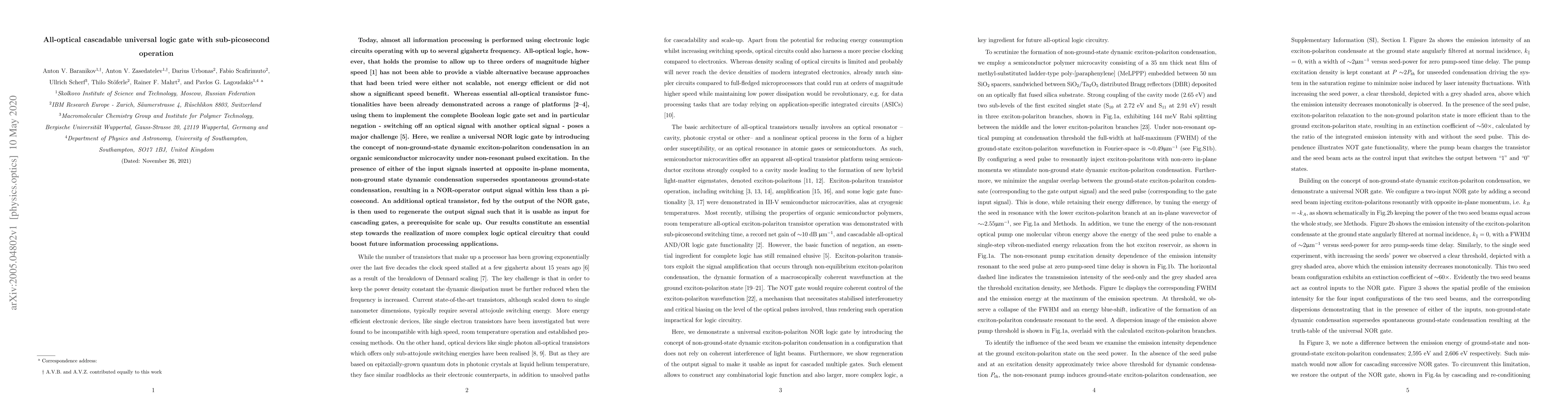This paper presents an all-optical universal NOR logic gate utilizing non-ground-state dynamic exciton-polariton condensation in an organic semiconductor microcavity, achieving sub-picosecond operation. An additional optical transistor regenerates the output signal for cascading, marking a significant step towards scalable, high-speed optical logic circuits.