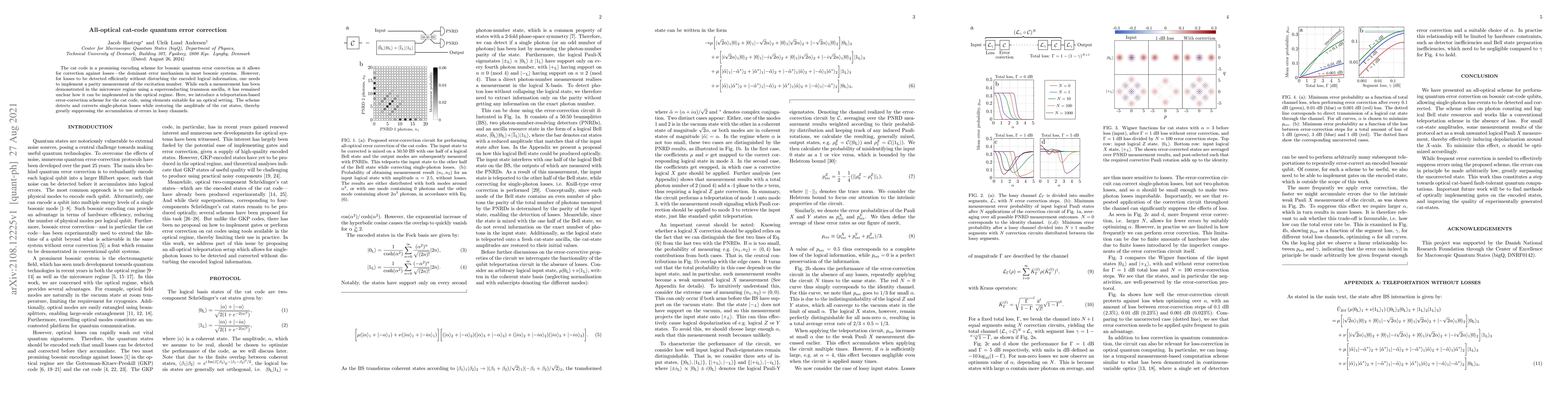 This paper presents an all-optical quantum error correction scheme for the cat code, utilizing teleportation to detect and correct single-photon losses without disturbing the encoded logical information, thus significantly reducing error accumulation in optical systems.
