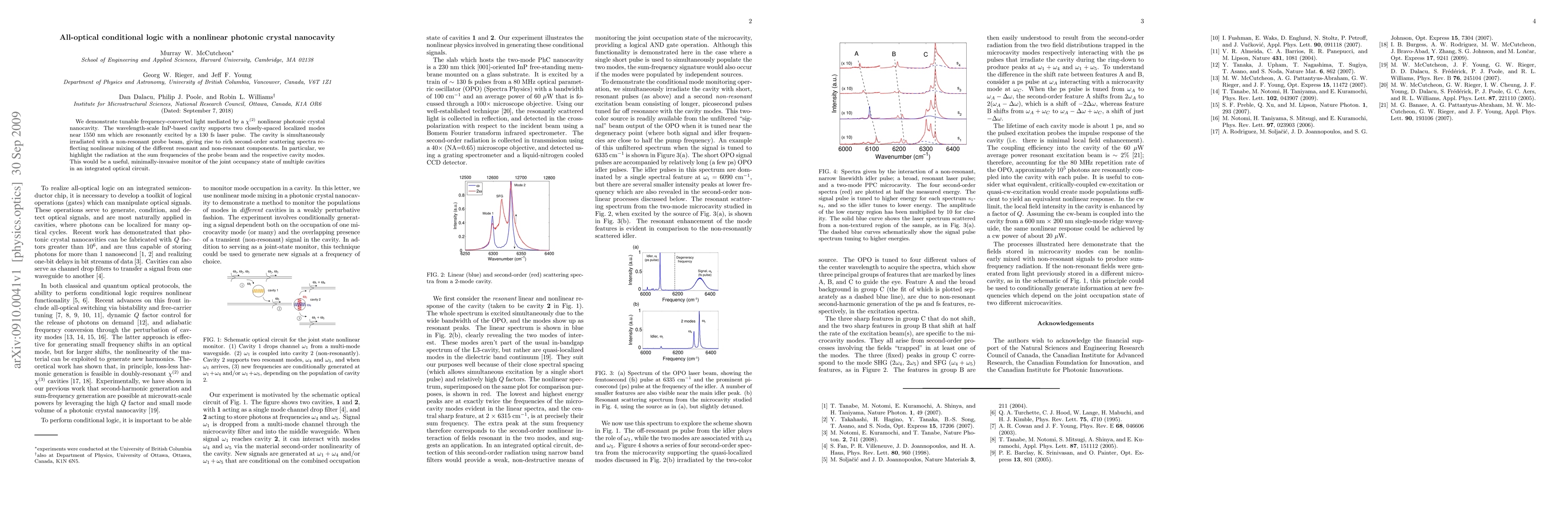 We demonstrate tunable frequency-converted light mediated by a chi-(2) nonlinear photonic crystal nanocavity. The wavelength-scale InP-based cavity supports two closely-spaced localized modes near 1550 nm which are resonantly excited by a 130 fs laser pulse. The cavity is simultaneously irradiated with a non-resonant probe beam, giving rise to rich second-order scattering spectra reflecting nonlinear mixing of the different resonant and non-resonant components. In particular, we highlight the radiation at the sum frequencies of the probe beam and the respective cavity modes. This would be a useful, minimally-invasive monitor of the joint occupancy state of multiple cavities in an integrated optical circuit.