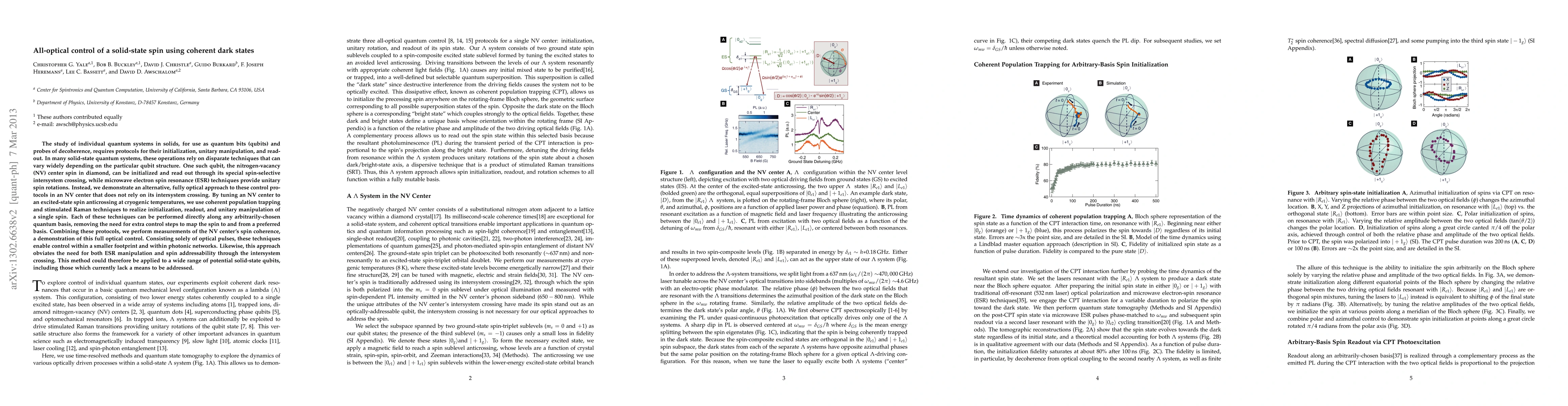 This paper demonstrates an all-optical method for initializing, reading, and manipulating the spin of a nitrogen-vacancy (NV) center in diamond using coherent population trapping and stimulated Raman techniques, eliminating the need for microwave electron spin resonance and spin-selective intersystem crossing. This approach enables control within photonic networks and could potentially be applied to various solid-state qubits.