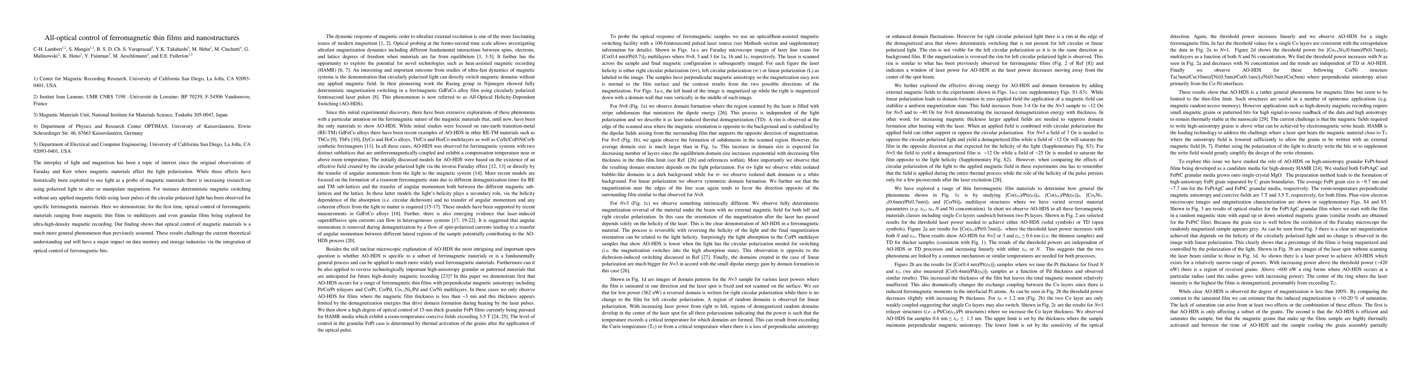 This paper demonstrates the first all-optical control of ferromagnetic thin films and nanostructures using circularly polarized laser pulses, revealing a broader applicability than previously thought. These findings challenge existing theories and hold significant potential for advancing data memory and storage technologies.