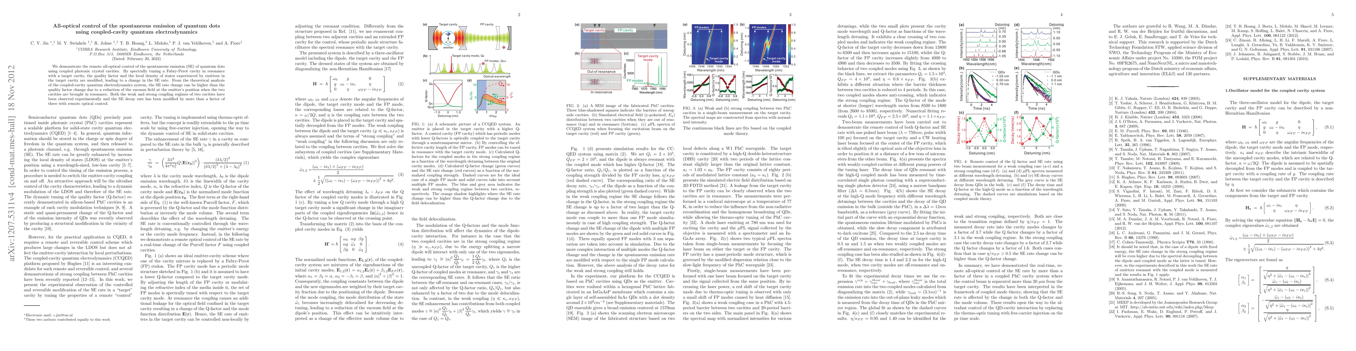 This paper demonstrates remote all-optical control of quantum dot spontaneous emission via coupled photonic crystal cavities, showing a more than threefold modification in emission decay rates through spectral tuning and quantum electrodynamics effects. Experimental results validate theoretical predictions in both weak and strong coupling regimes.