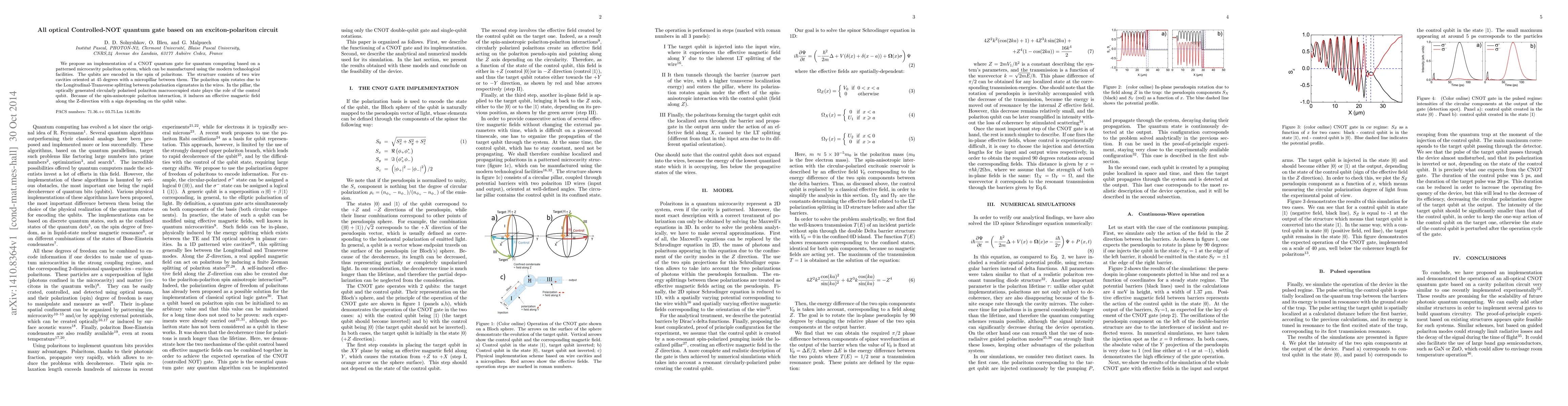 We propose an implementation of a CNOT quantum gate for quantum computing based on a patterned microcavity polariton system, which can be manufactured using the modern technological facilities. The qubits are encoded in the spin of polaritons. The structure consists of two wire cavities oriented at 45 degrees with a micropillar between them. The polariton spin rotates due to the Longitudinal-Transverse splitting between polarisation eigenstates in the wires. In the pillar, the optically generated circularly polarised polariton macrooccupied state plays the role of the control qubit. Because of the spin-anisotropic polariton interaction, it induces an effective magnetic field along the Z-direction with a sign depending on the qubit value.