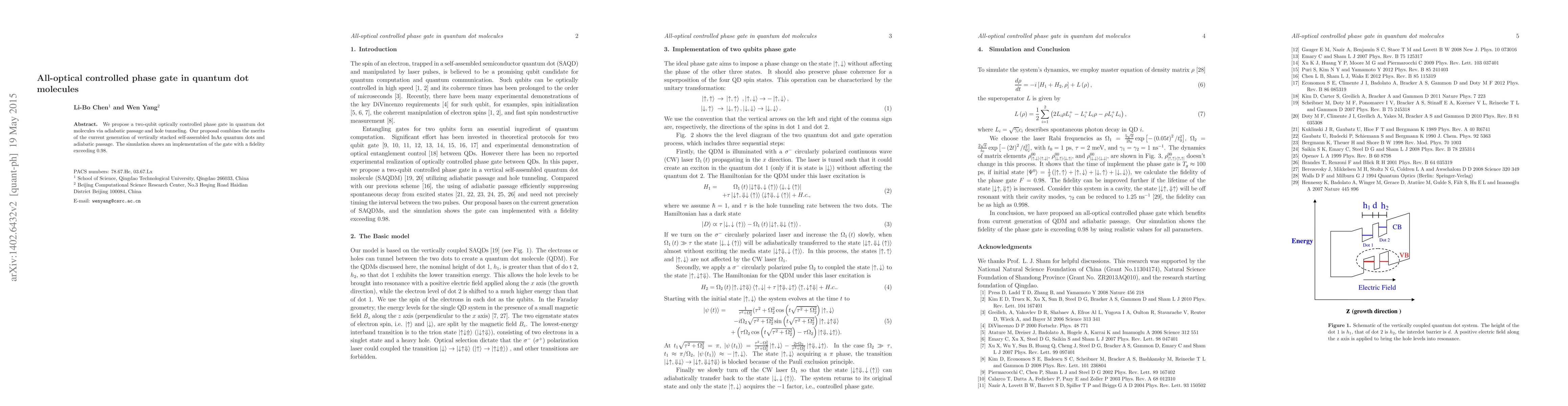 This paper proposes a two-qubit phase gate in quantum dot molecules using optically controlled adiabatic passage and hole tunneling, achieving a fidelity of over 98% through simulations. The design leverages the advantages of vertically stacked self-assembled InAs quantum dots.