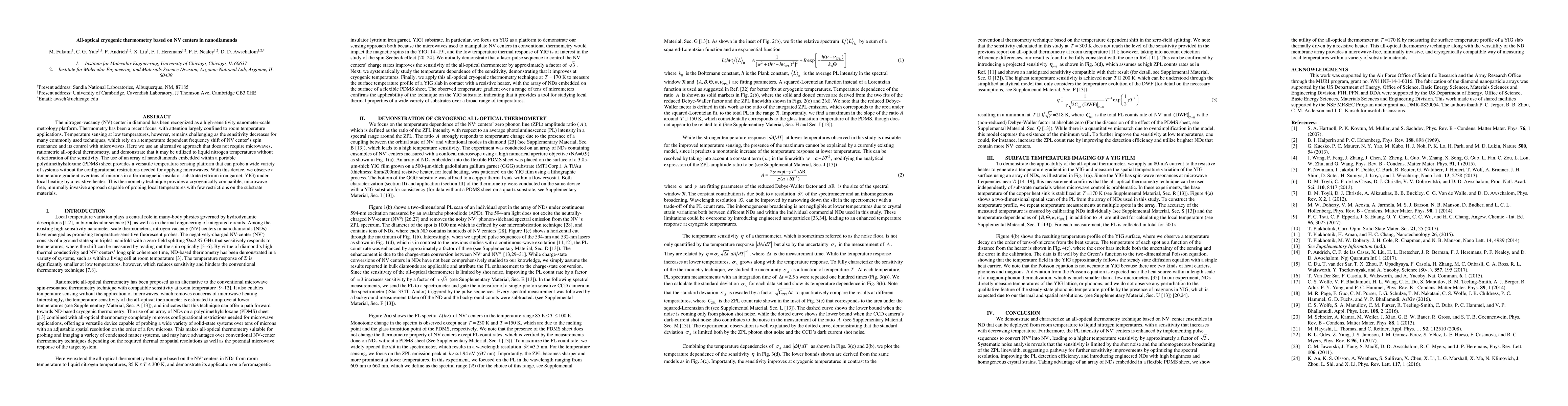 This paper presents an all-optical thermometry technique using NV centers in nanodiamonds for cryogenic temperature sensing, which avoids the sensitivity loss of microwave-based methods and operates effectively at liquid nitrogen temperatures. The proposed method, embedded in a portable PDMS sheet, enables local temperature probing in various systems without microwave configurational constraints.