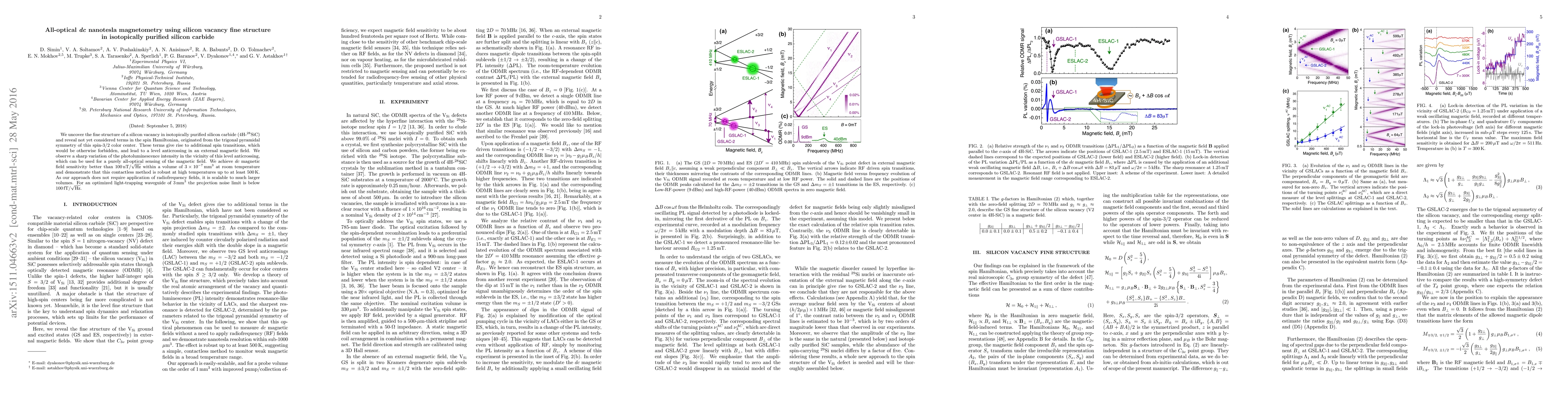 We uncover the fine structure of a silicon vacancy in isotopically purified silicon carbide (4H-$^{28}$SiC) and find extra terms in the spin Hamiltonian, originated from the trigonal pyramidal symmetry of this spin-3/2 color center. These terms give rise to additional spin transitions, which are otherwise forbidden, and lead to a level anticrossing in an external magnetic field. We observe a sharp variation of the photoluminescence intensity in the vicinity of this level anticrossing, which can be used for a purely all-optical sensing of the magnetic field. We achieve dc magnetic field sensitivity of 87 nT Hz$^{-1/2}$ within a volume of $3 \times 10^{-7}$ mm$^{3}$ at room temperature and demonstrate that this contactless method is robust at high temperatures up to at least 500 K. As our approach does not require application of radiofrequency fields, it is scalable to much larger volumes. For an optimized light-trapping waveguide of 3 mm$^{3}$ the projection noise limit is below 100 fT Hz$^{-1/2}$.