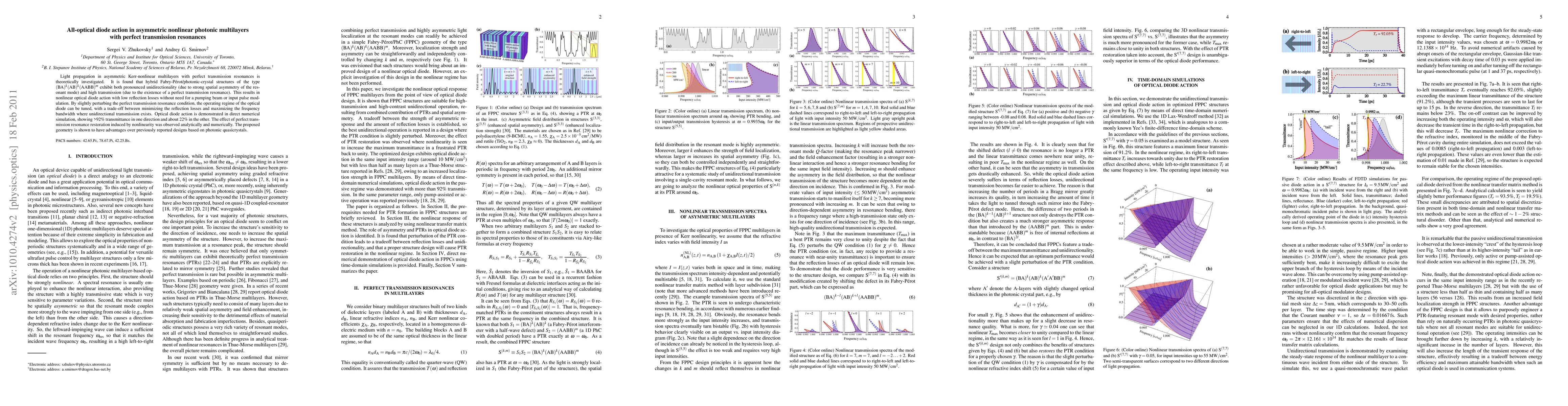 The paper investigates asymmetric Kerr-nonlinear multilayers with perfect transmission resonances, showing they can function as optical diodes with low reflection losses due to strong spatial asymmetry and a perfect transmission resonance. Numerical simulations demonstrate >92% unidirectional transmittance and 22% in the opposite direction, with the optical diode's regime tunable by adjusting resonance conditions.