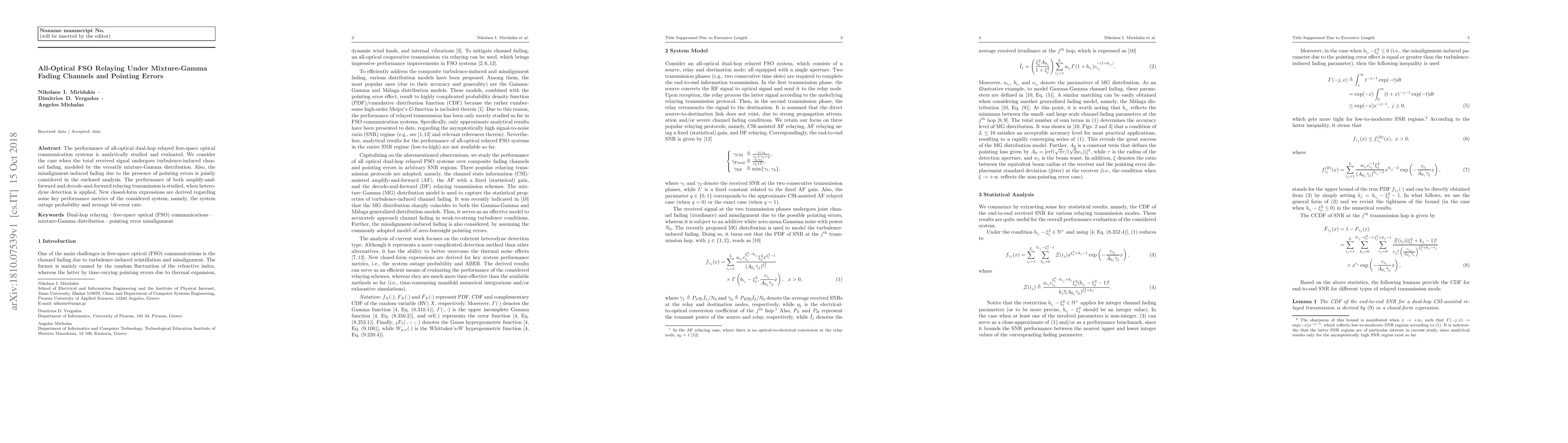 This paper analytically evaluates the performance of all-optical dual-hop FSO relaying systems under mixture-Gamma fading and pointing errors. It derives new closed-form expressions for system outage probability and average bit-error rate for both amplify-and-forward and decode-and-forward relaying methods.