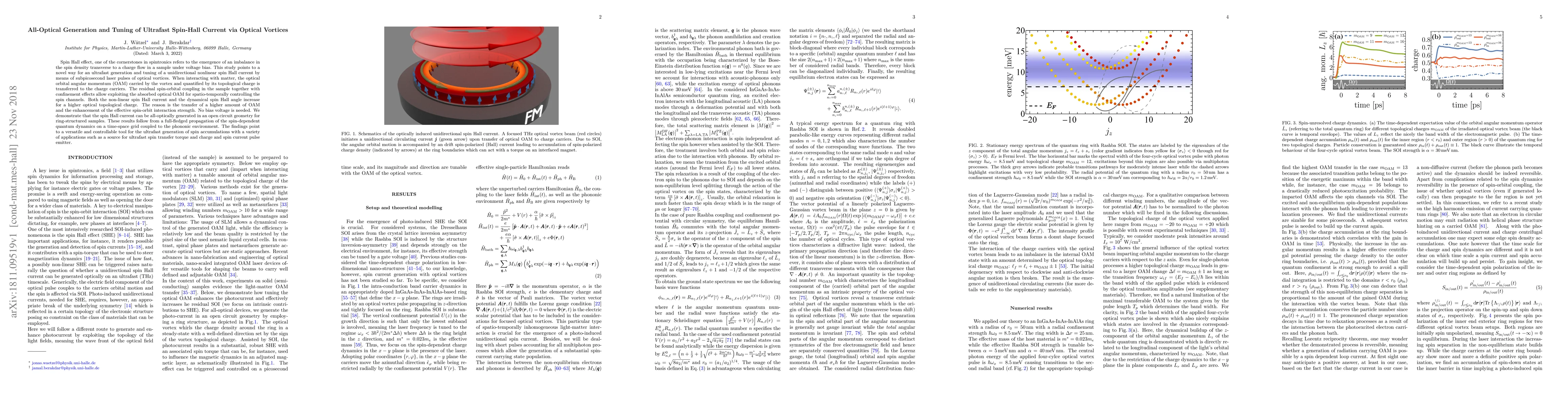 This study demonstrates an all-optical method for generating and tuning ultrafast spin-Hall currents using subpicosecond laser pulses with optical vortices. The optical orbital angular momentum is transferred to charge carriers, enabling the control of spin channels without the need for a bias voltage.