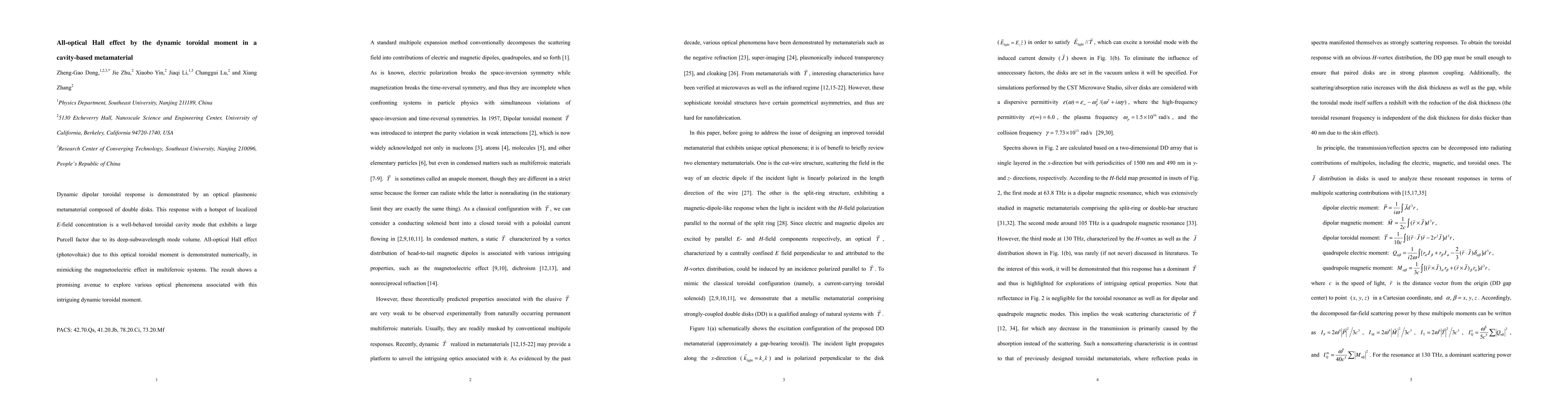 This paper demonstrates an optical plasmonic metamaterial using double disks that exhibits a dynamic toroidal moment, leading to an all-optical Hall effect. The toroidal cavity mode shows a large Purcell factor and mimics the magnetoelectric effect, suggesting new avenues for optical phenomena exploration.