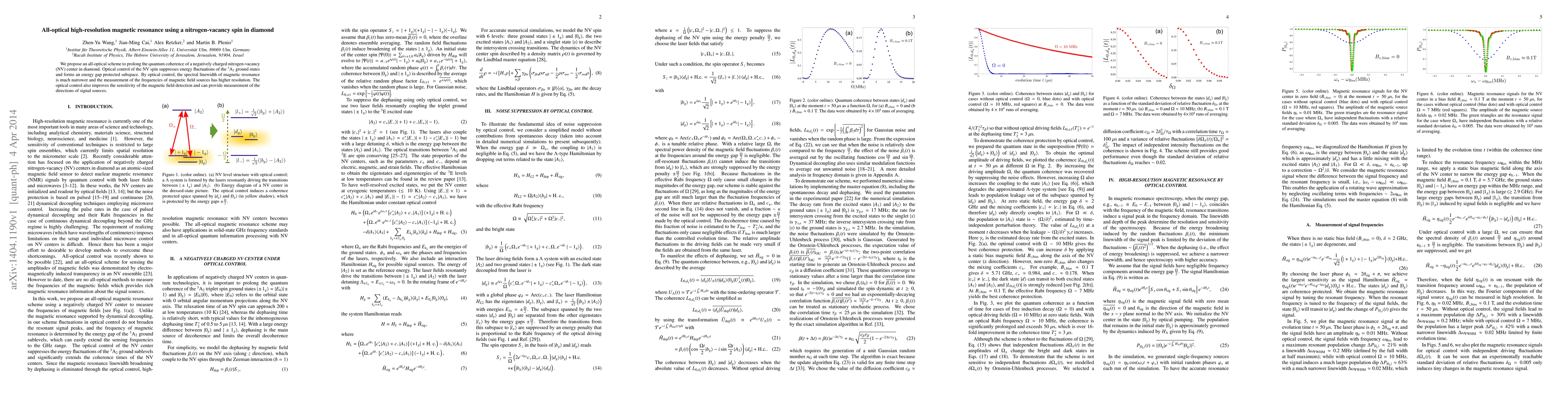 This paper proposes an all-optical method to enhance the quantum coherence of nitrogen-vacancy centers in diamond, achieving higher resolution magnetic resonance through optical suppression of energy fluctuations, thus improving both the sensitivity and directionality of magnetic field detection.