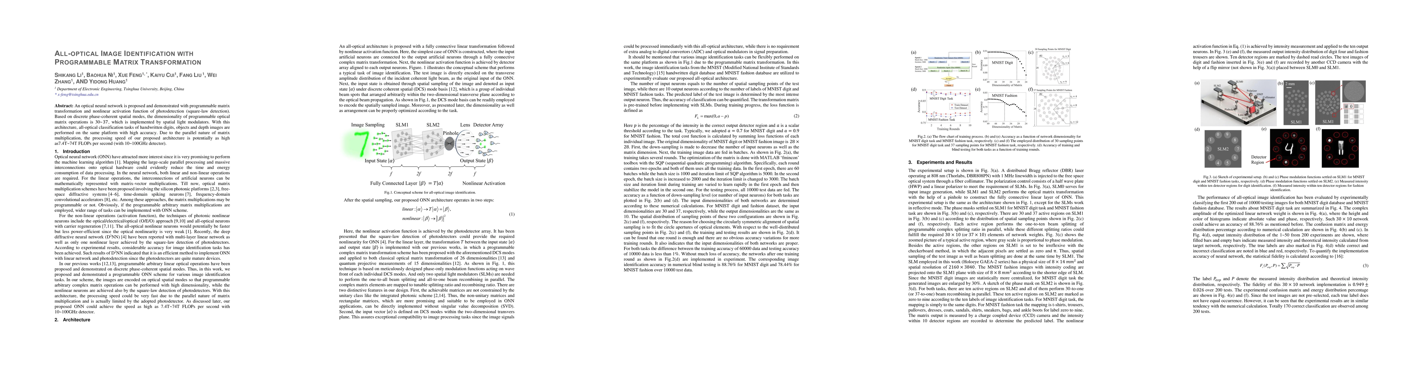 This paper proposes an optical neural network utilizing programmable matrix transformations and photodetection for all-optical image classification tasks, achieving high accuracy. The architecture supports parallel processing speeds up to 7.4T~74T FLOPs per second, demonstrating its potential for fast, high-dimensional optical computations.