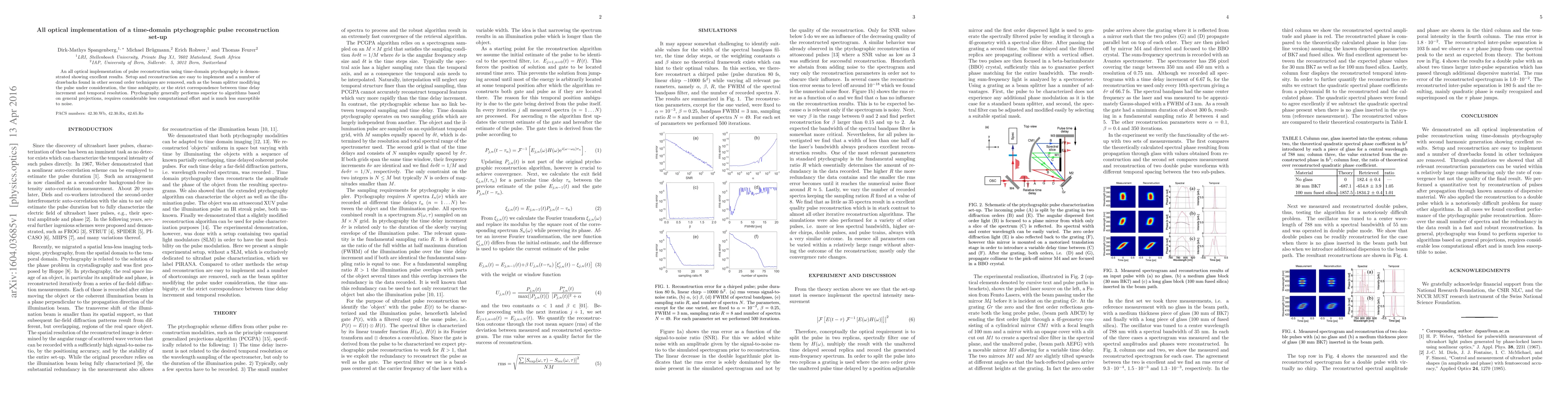An all optical implementation of pulse reconstruction using time-domain ptychography is demonstrated showing excellent results. Setup and reconstruction are easy to implement and a number of drawbacks found in other second order techniques are removed, such as the beam splitter modifying the pulse under consideration, the time ambiguity, or the strict correspondence between time delay increment and temporal resolution. Ptychography generally performs superior to algorithms based on general projections, requires considerable less computational effort and is much less susceptible to noise.