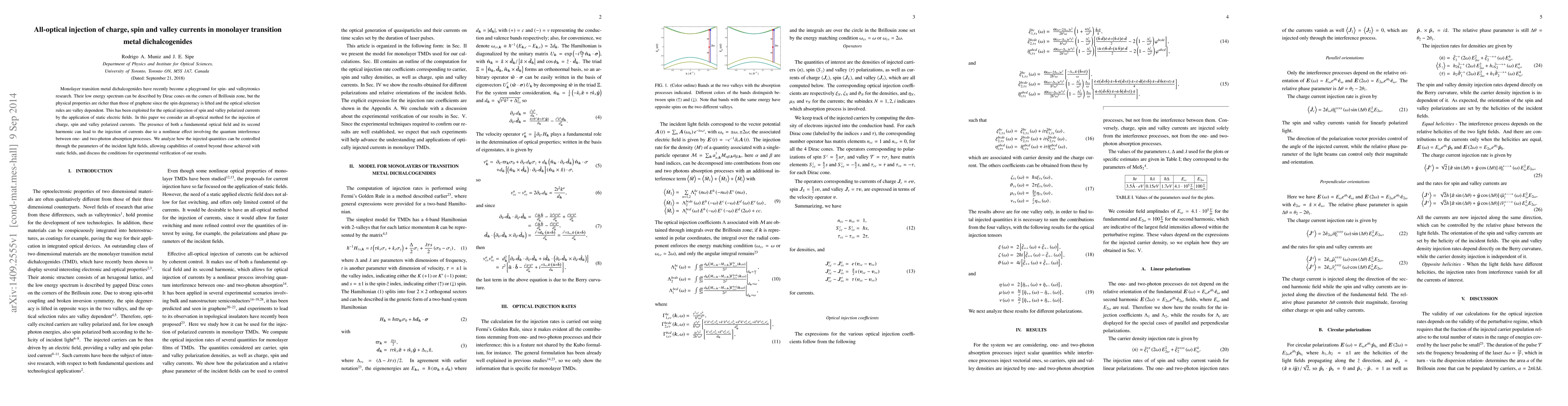 This paper explores an all-optical method for injecting charge, spin, and valley currents in monolayer transition metal dichalcogenides via nonlinear quantum interference effects involving fundamental and second harmonic optical fields. The study discusses control mechanisms through incident light parameters and outlines experimental conditions for verification.